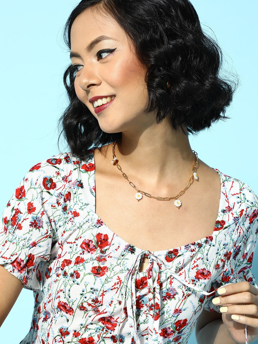Say hello to the summer season with trendy statement pieces like this White & Red Floral Printed Sweetheart Neck Tie-Up Front Crepe Fit & Flare Mini Dress from Berrylush. Accentuated with a romantic red floral print all-over the white shade gives this dress a cheerful appearance with a joyful vibe. Adorned with a flared hemline that lends this dress a voluminous look with a bouncy drape. Also, the short-regular sleeves adjoin a periodical style note to this dress with a modern finish. Wear this dress with a pair of floral block heels, a pearl pendant, and a stylish red handbag to create a stunning look for your next picnic date.