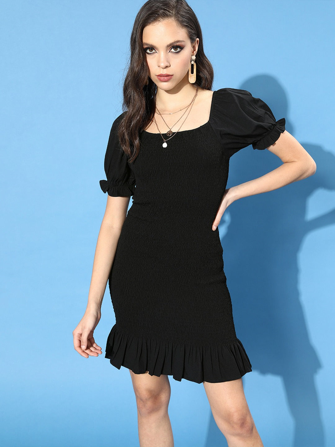 Inject a stylish and free-spirited feel to your party outfit collection this season with this bedazzling Solid Black Crepe Bodycon Fit & Flare Mini Dress from Berrylush. Punctuated from crepe polyester fabric to get you a super soft touch to your skin with wrinkle resistance. The fit and flare shape of the dress gives you a figure-flattering fit with a charming modern finish. The square neck design flaunts your beautiful neckline delicately while the short puffed sleeves add shimmering detailing to your arms with the modish appeal. Smocked surface styling lends your party-perfect look by presenting feminine charm. The mini length with woven detailing gets you seductive appeal with the durable property. Complete the look by pairing this contemporary dress with a high-heel and a stylish purse to get a striking final outlook.