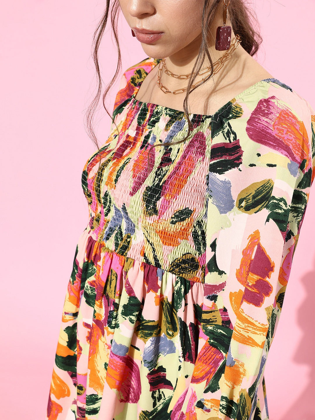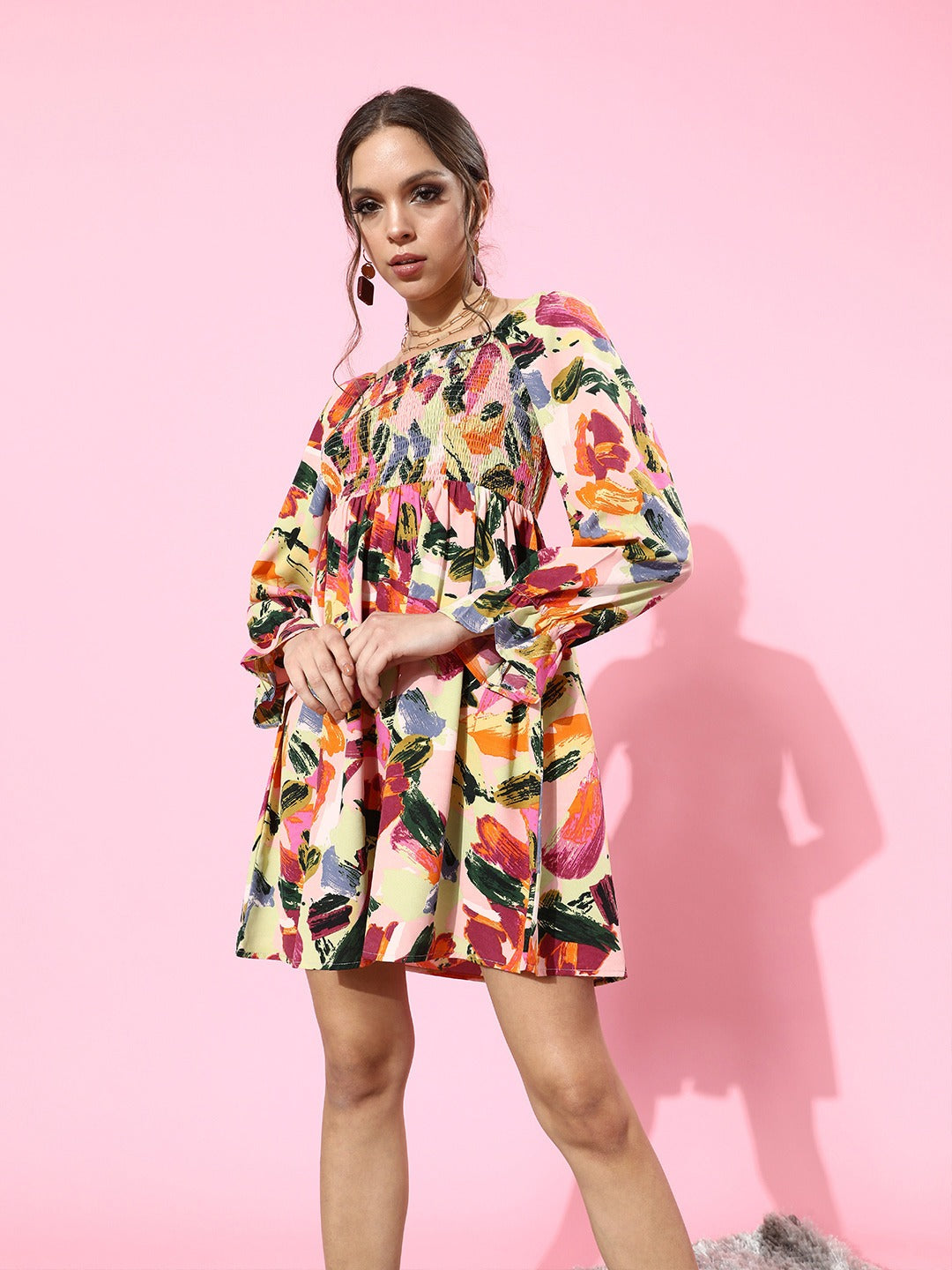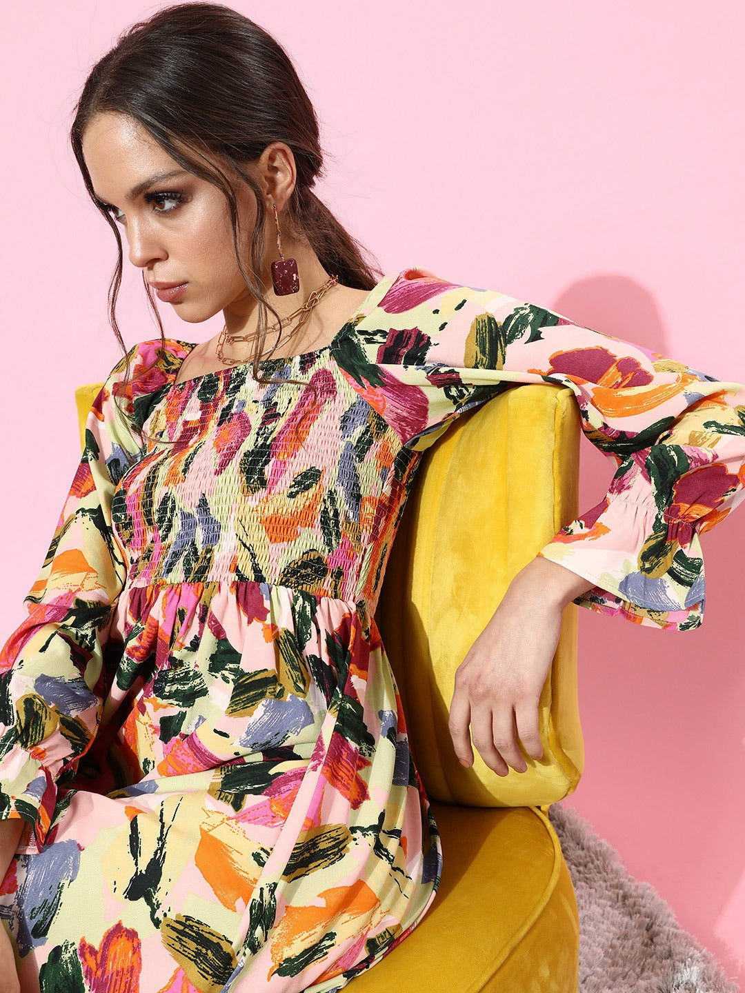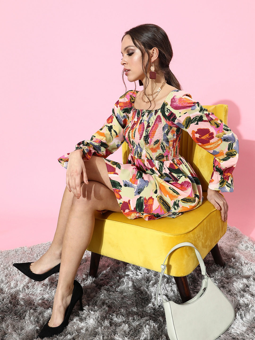 Berrylush Women White & Pink Abstract Printed Square Neck Crepe Smocked Fit & Flare Mini Dress