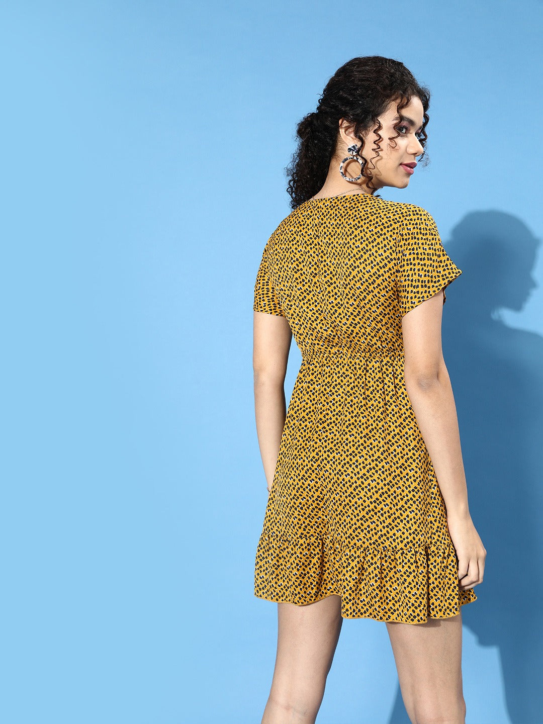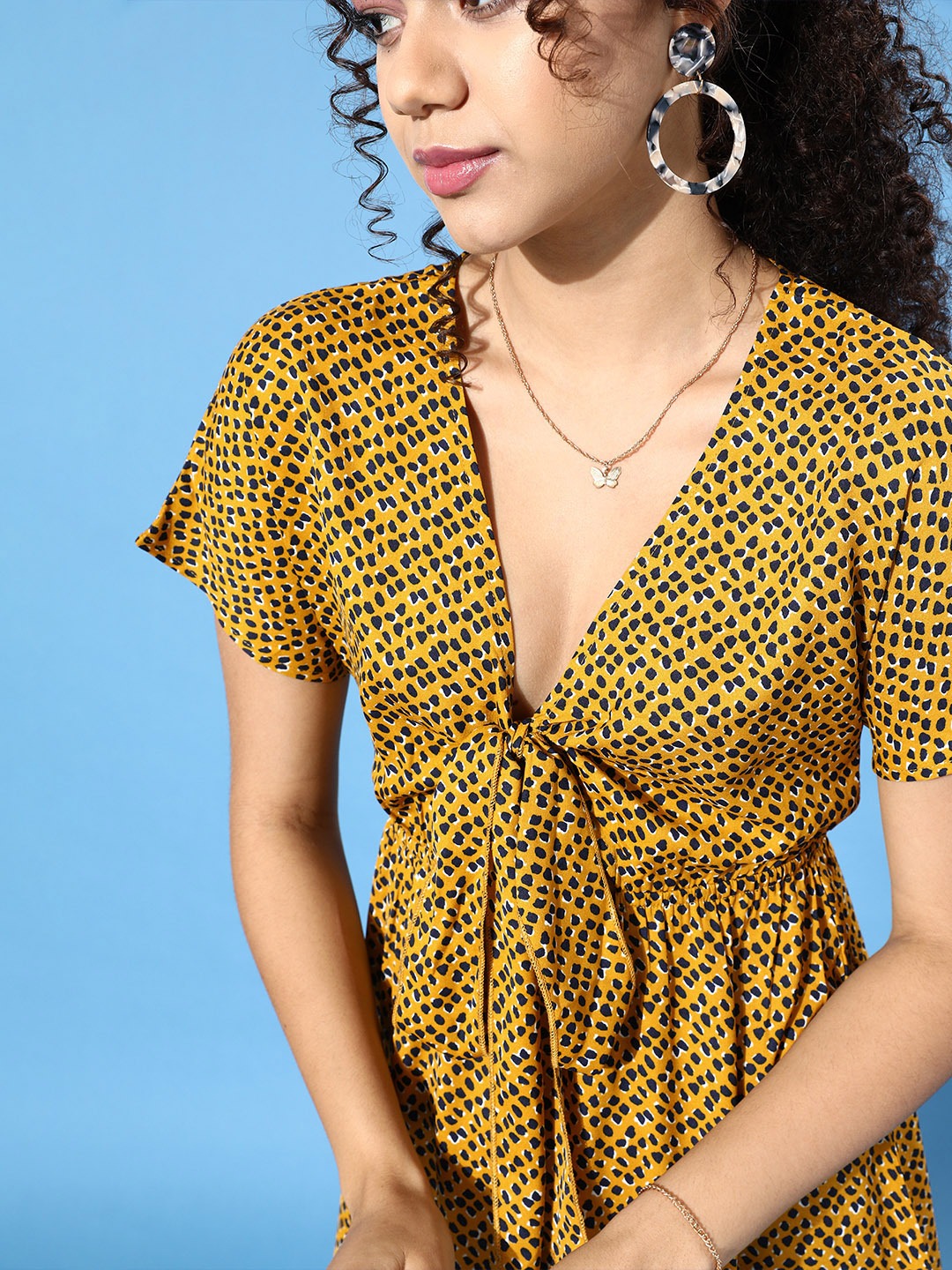 Amp up your casual style with the addition of some chic elements like this cinematic Yellow Animal Printed Crepe A-Line Mini Dress from Berrylush. This dress gets you a graceful charm with its short and batwing sleeve which gives your arms comfortable and fashionable texture. The flounce hemline with an A-line shape steals the limelight by elegantly defining your beautiful figure with a smooth sheen. Milled from crepe polyester fabric to provide the moisture-wicking property with a delicate feel to your skin. The animal print on the yellow colour reflects a bold and confident vibe from your casual look, similar to a cheetah enthusiasm. You can pair this stunning dress with strappy heels and a cute clutch to get a ravishing look.