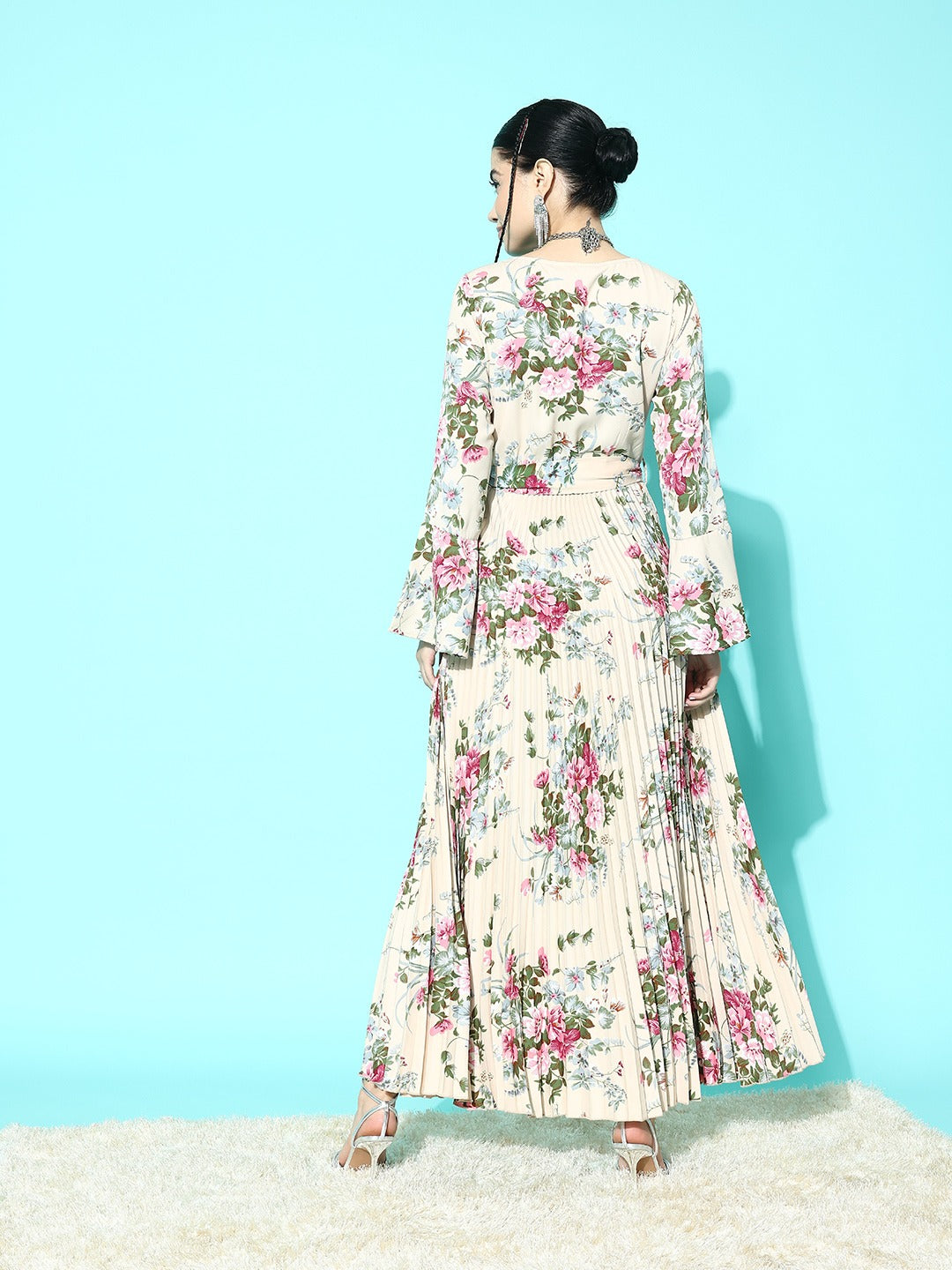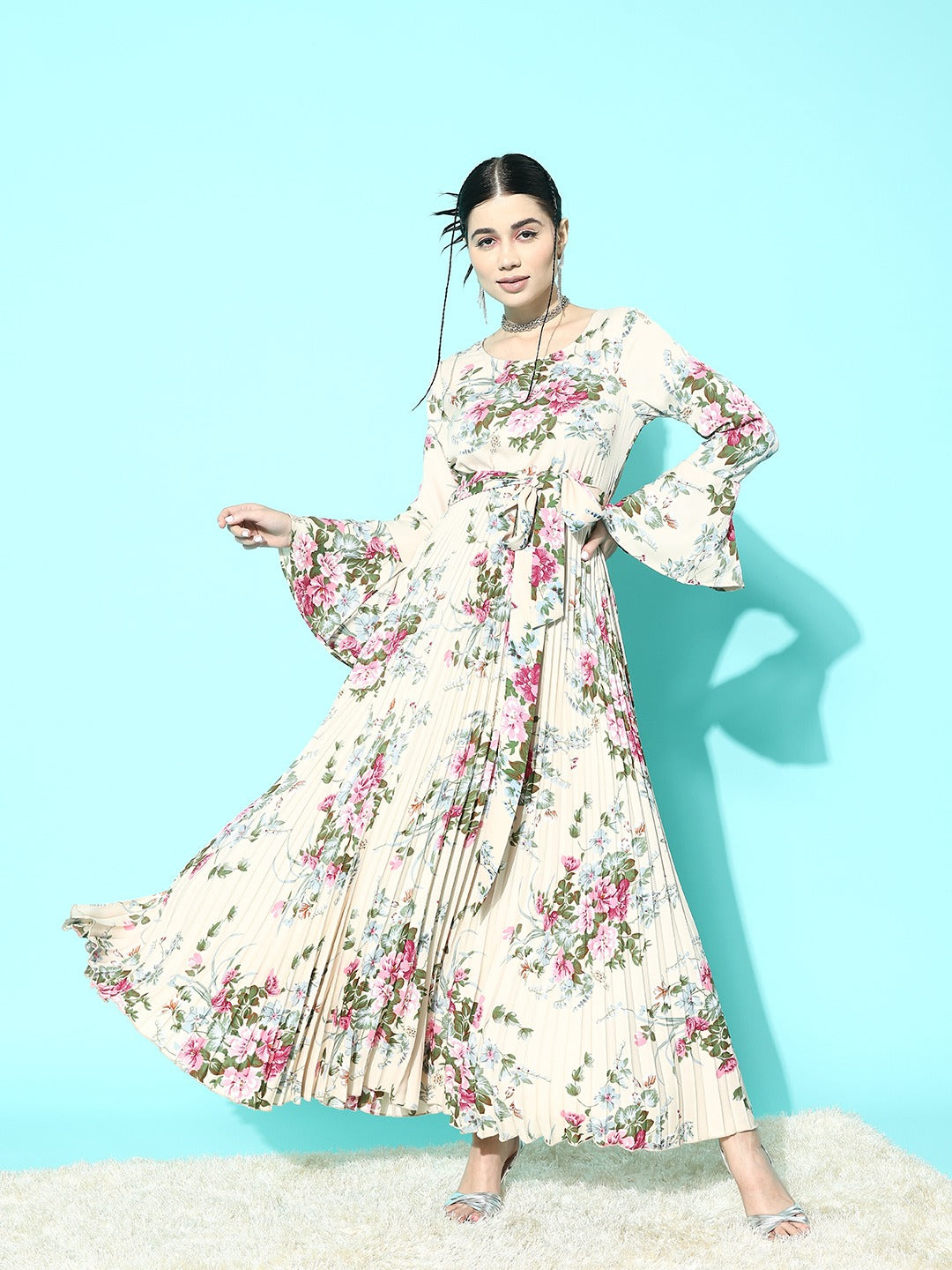 Berrylush Women Beige & Green Floral Printed Round Neck Bell Sleeves Waist Tie-Up Crepe Pleated A-Line Maxi Dress