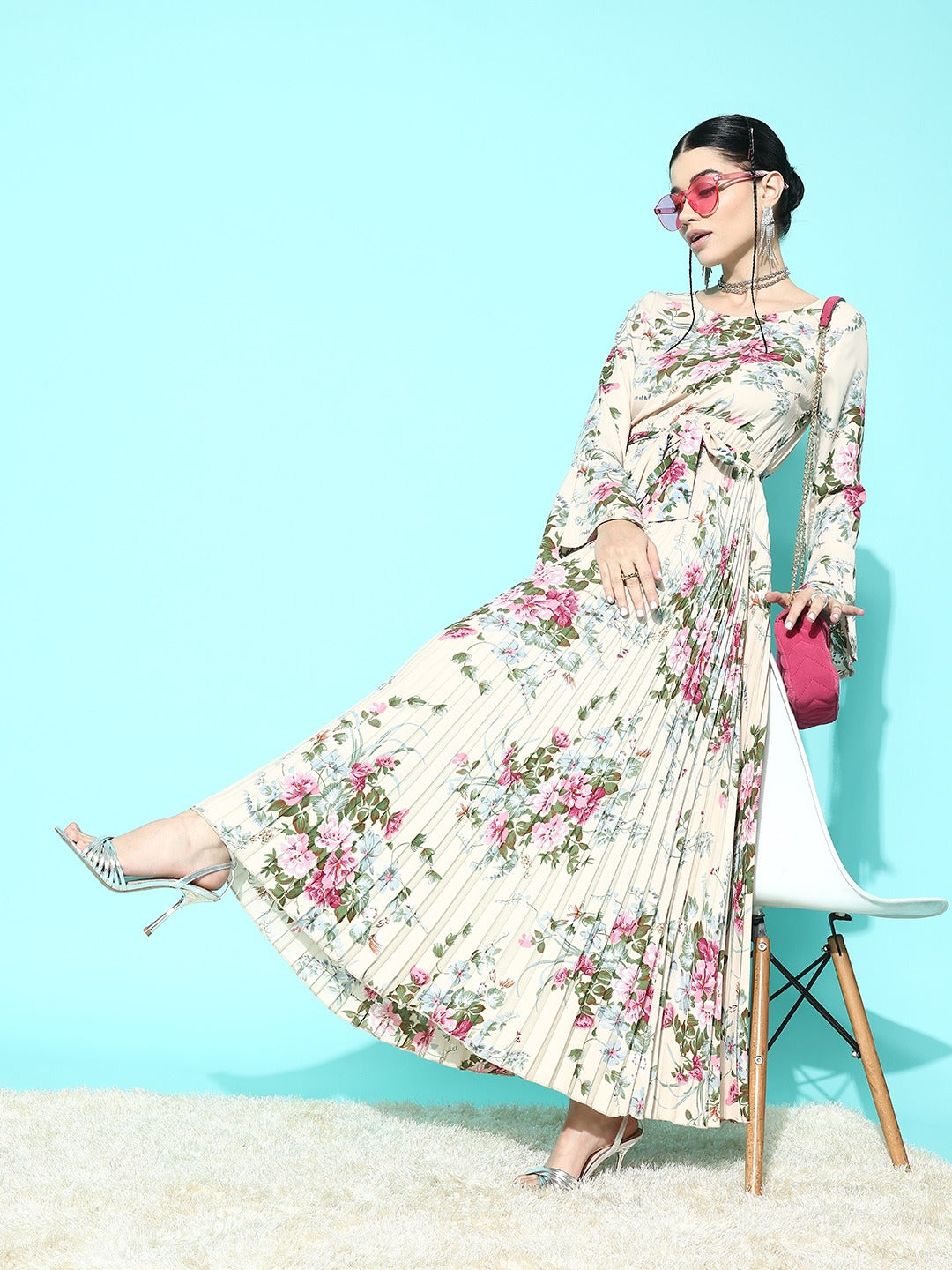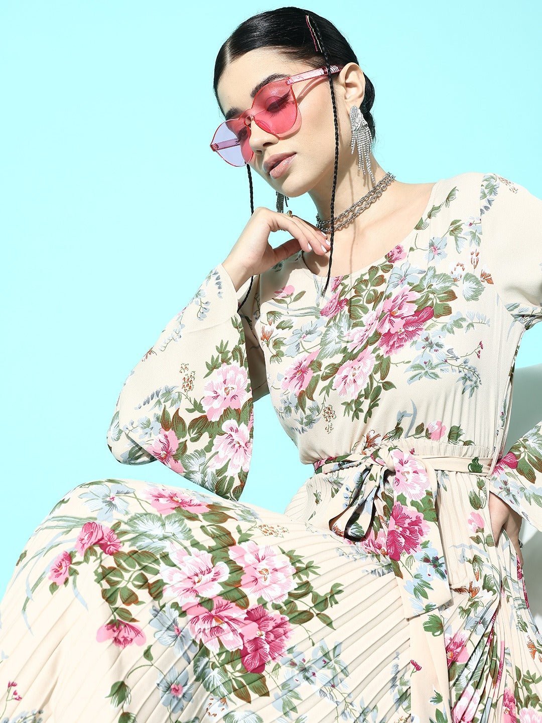 Carry your bold rhythm and flaunt your intimate side this party season by adding to your shopping cart this ravishing Beige & Green Floral Printed Round Neck Waist Tie-Up Crepe Pleated A-Line Maxi Dress from Berrylush. Beautifully structured in an A-line shape that gives this dress sartorial perfection with a form-fitting silhouette followed by a flared hemline. Made from the finest crepe polyester fabric that keeps this dress light in weight with limitless breathability. Flaunting woven weave that offers this dress improved structural integrity and seamless stitching for a clean outer appearance. Attend the upcoming party events looking glamorous by wearing this maxi dress with a pair of high-heels, minimalistic diamond jewellery, and a matching clutch.