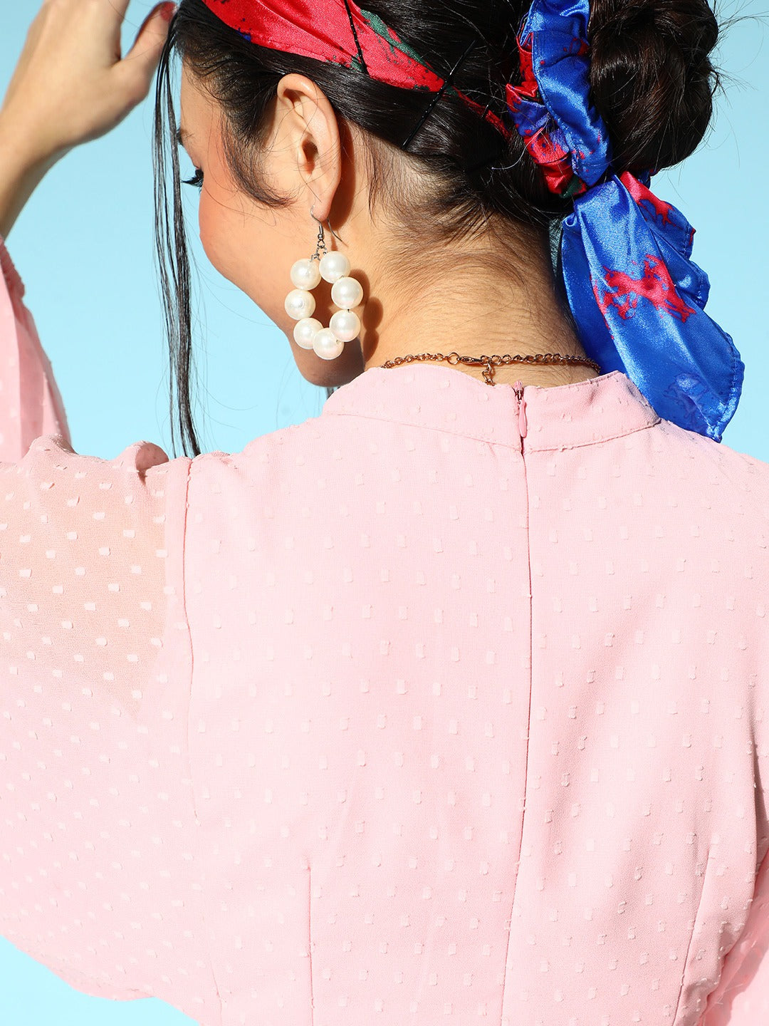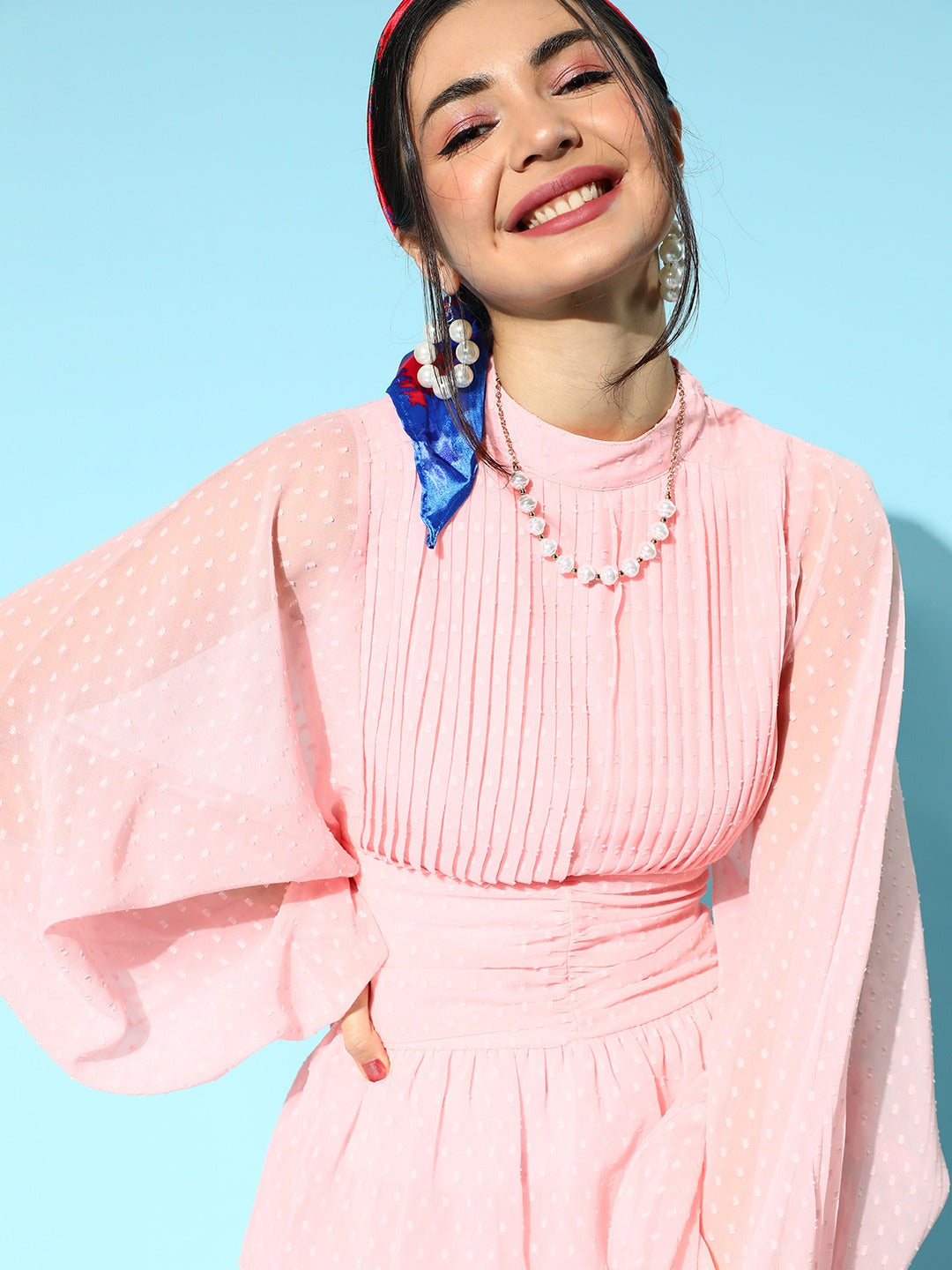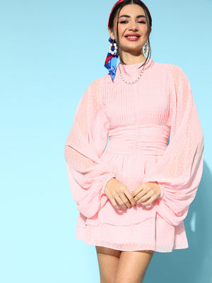 Berrylush Women Solid Pink Round Neck Sheer Sleeves Georgette Flounce Hem Pleated Fit & Flare Mini Dress