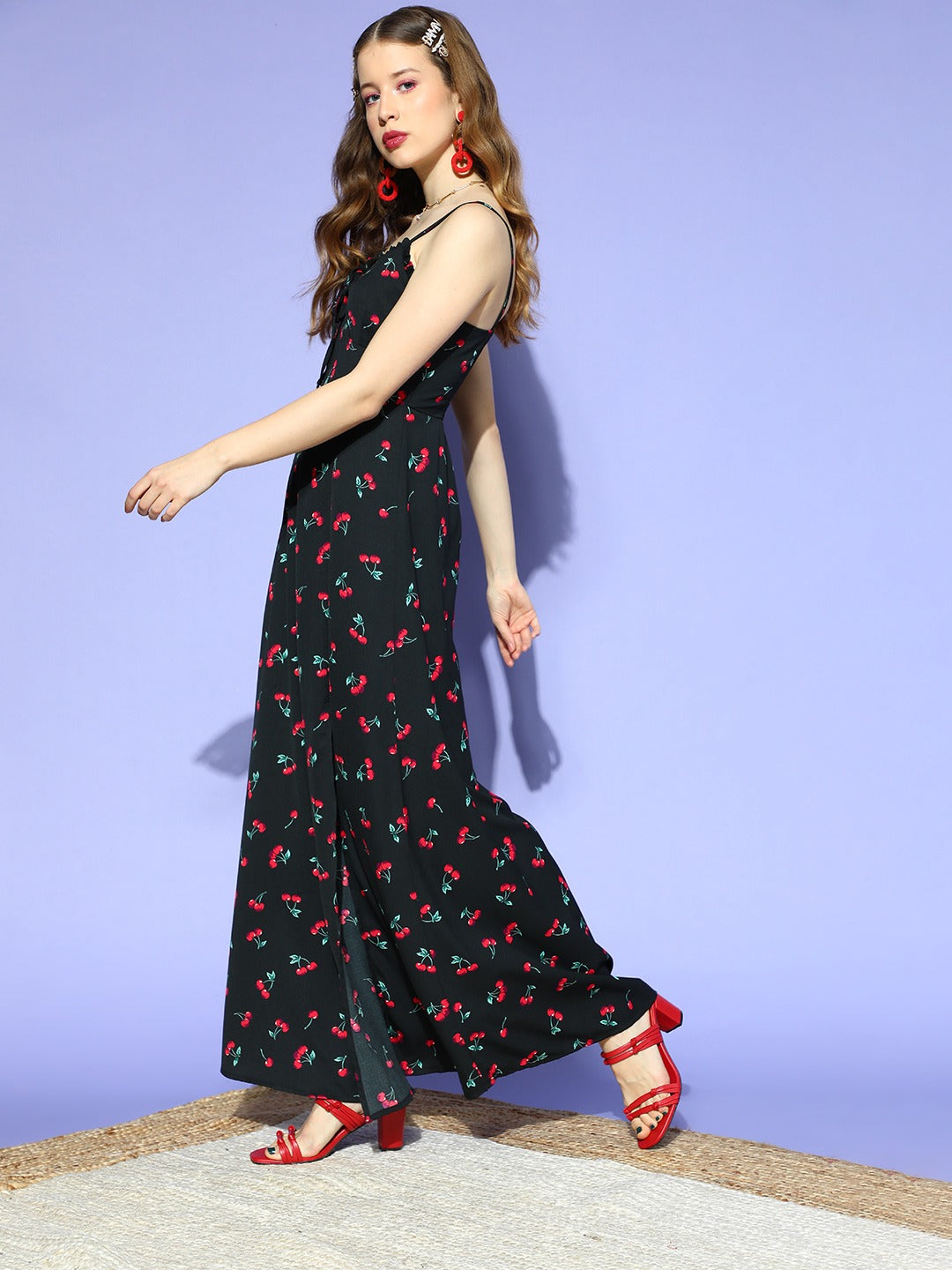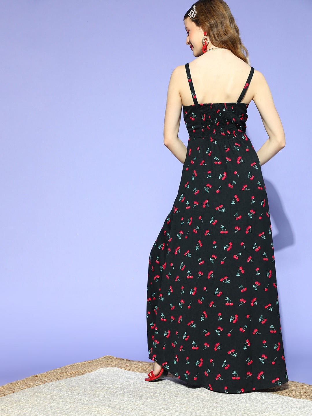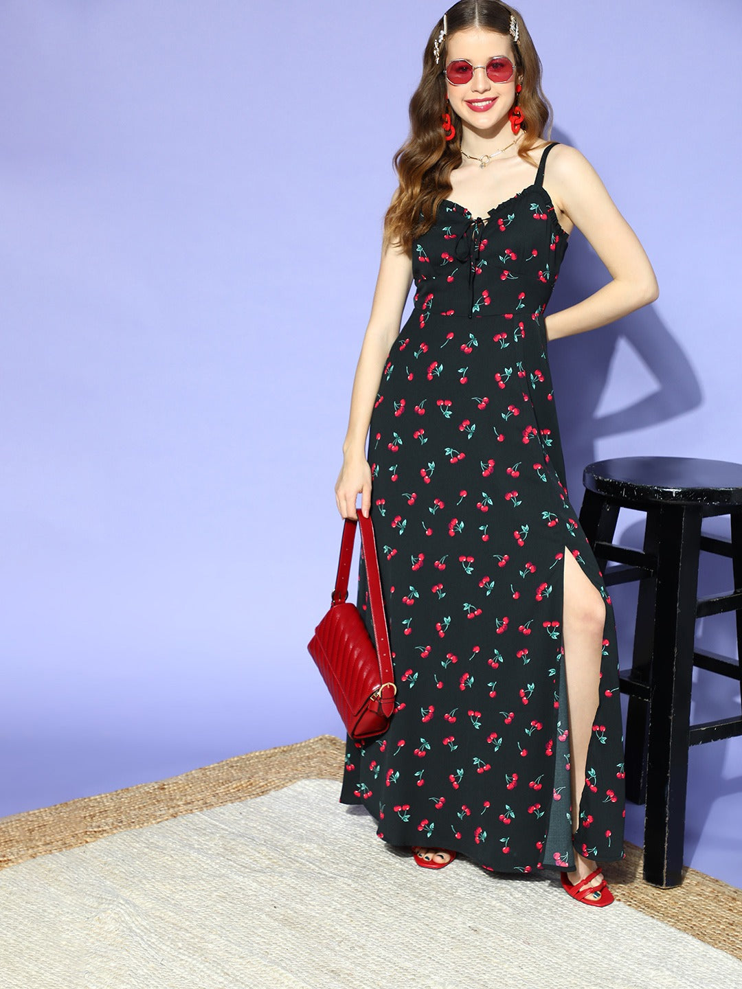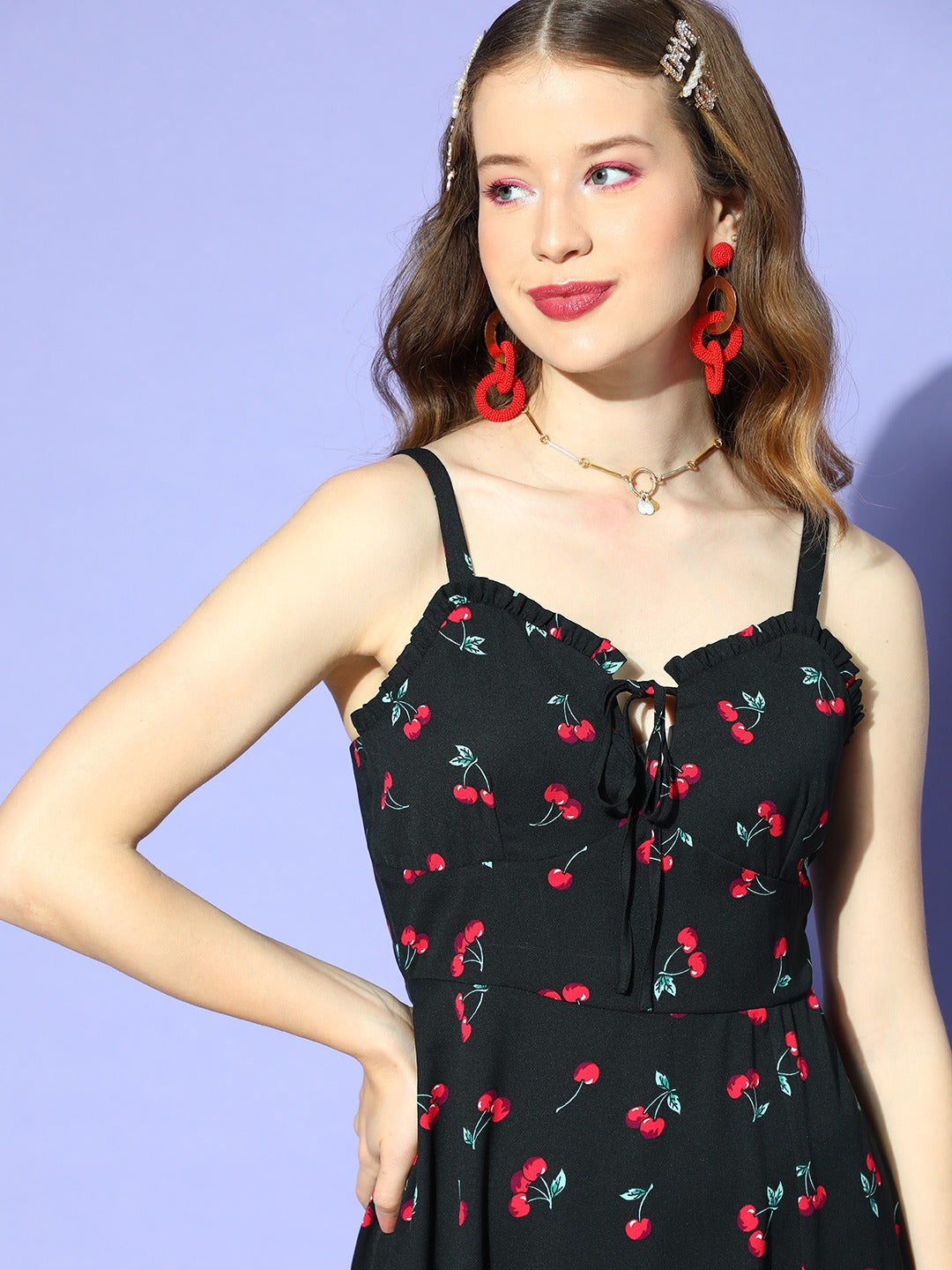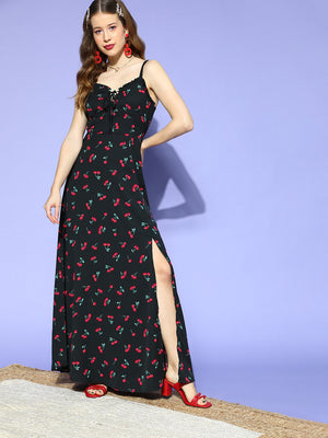 Berrylush Women Black & Red Cherry Printed Sweetheart Neck Front Tie-Up High-Slit Flared Maxi Dress