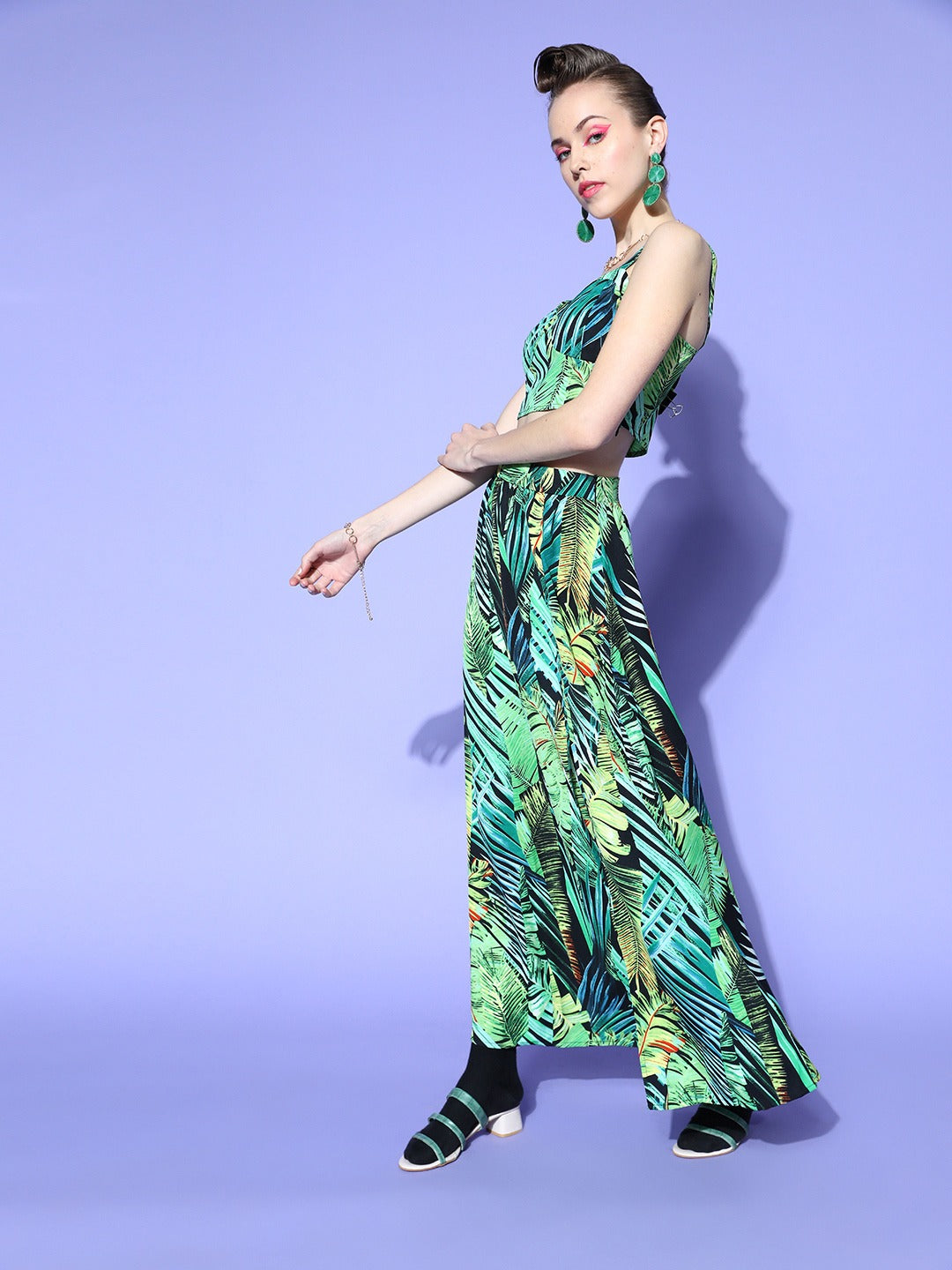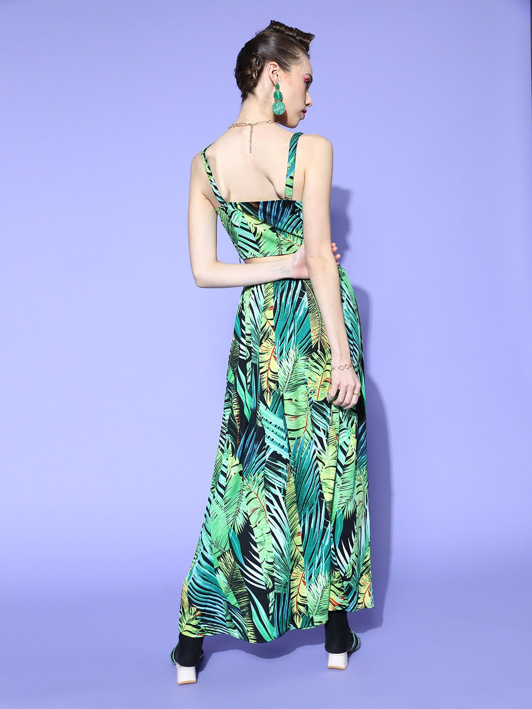 Get yourself wrapped up in the vibrant ascent of green and an energetic vibe with this glamourous Green & Yellow Floral Printed Sweetheart Neck Thigh-High Slit A-Line Maxi Co-Ordinate Set introduced by Berrylush. This coordinate set includes a crop-length top that showcases your waistline area and presents your bold and sexy look. The skirt comes in maxi length accompanied by a straight hemline that gives your lower body portion attractive coverage while elegantly defining your curves. Also, the skirt comes with a side slit to give your legs an enticing exposure which keeps you ventilated with a comfortable walking experience. Match this coordinate set with a pair of stylish sandals, a headband, and a fashionable tote bag to get a fashionable appearance.