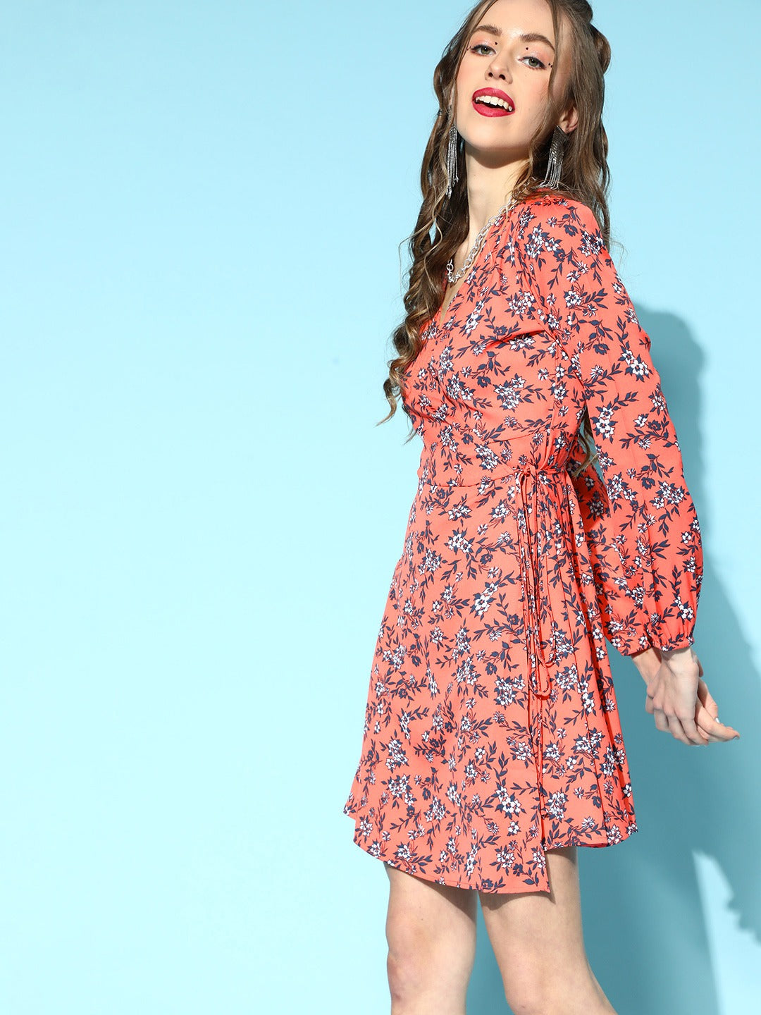 Berrylush Women Orange & Navy Blue Floral Printed V-Neck Waist Tie-Up Tulip Hem Wrap Mini Dress
