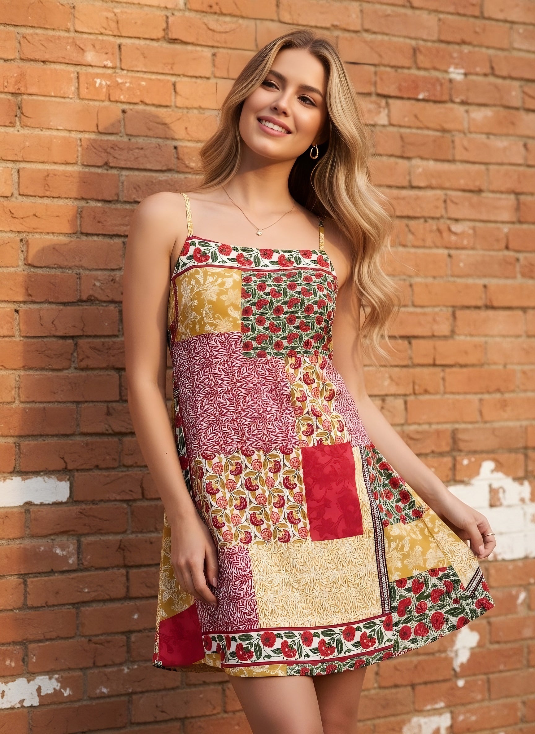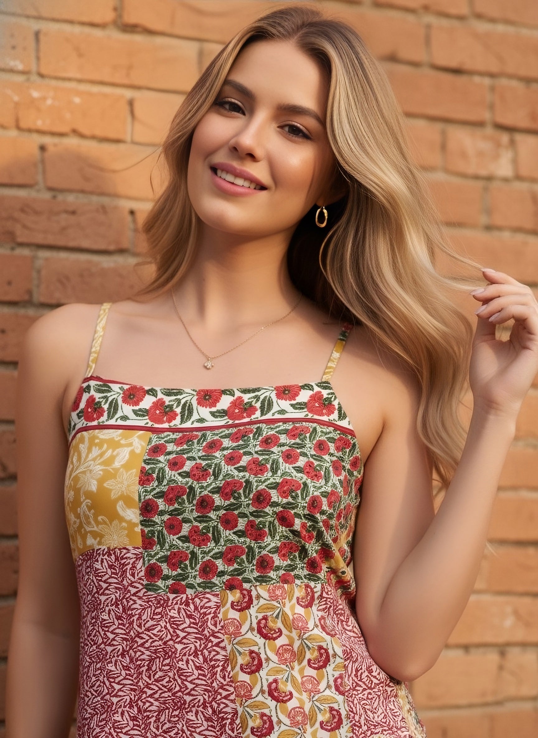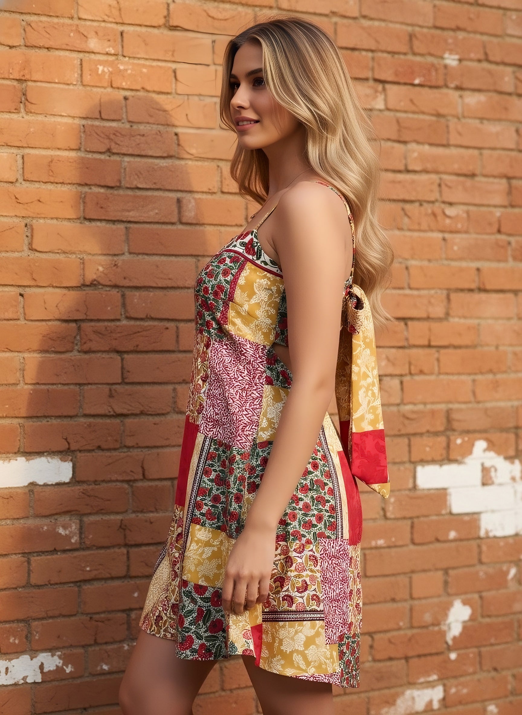 Embrace effortless style in every step with this stunning Red & Yellow Floral Printed Bodycon Mini Dress by Berrylush. This eye-catching piece features a playful square neckline and a sleeveless design that highlights your shoulders while offering comfort and elegance. The vibrant floral print brilliantly combines shades of red and yellow, perfect for those sunny days or lively gatherings. Crafted from high-quality woven polyester, this dress has an opaque finish that showcases your figure beautifully without compromising on modesty. A unique back tie-up closure adds a touch of charm, allowing you to adjust it for the perfect fit as well as accentuating the flirty cutout detail at the waist. With its straight hemline tailored to flaunt your legs, this bodycon mini dress is designed to turn heads wherever you go, be it brunch with friends or romantic evenings out!