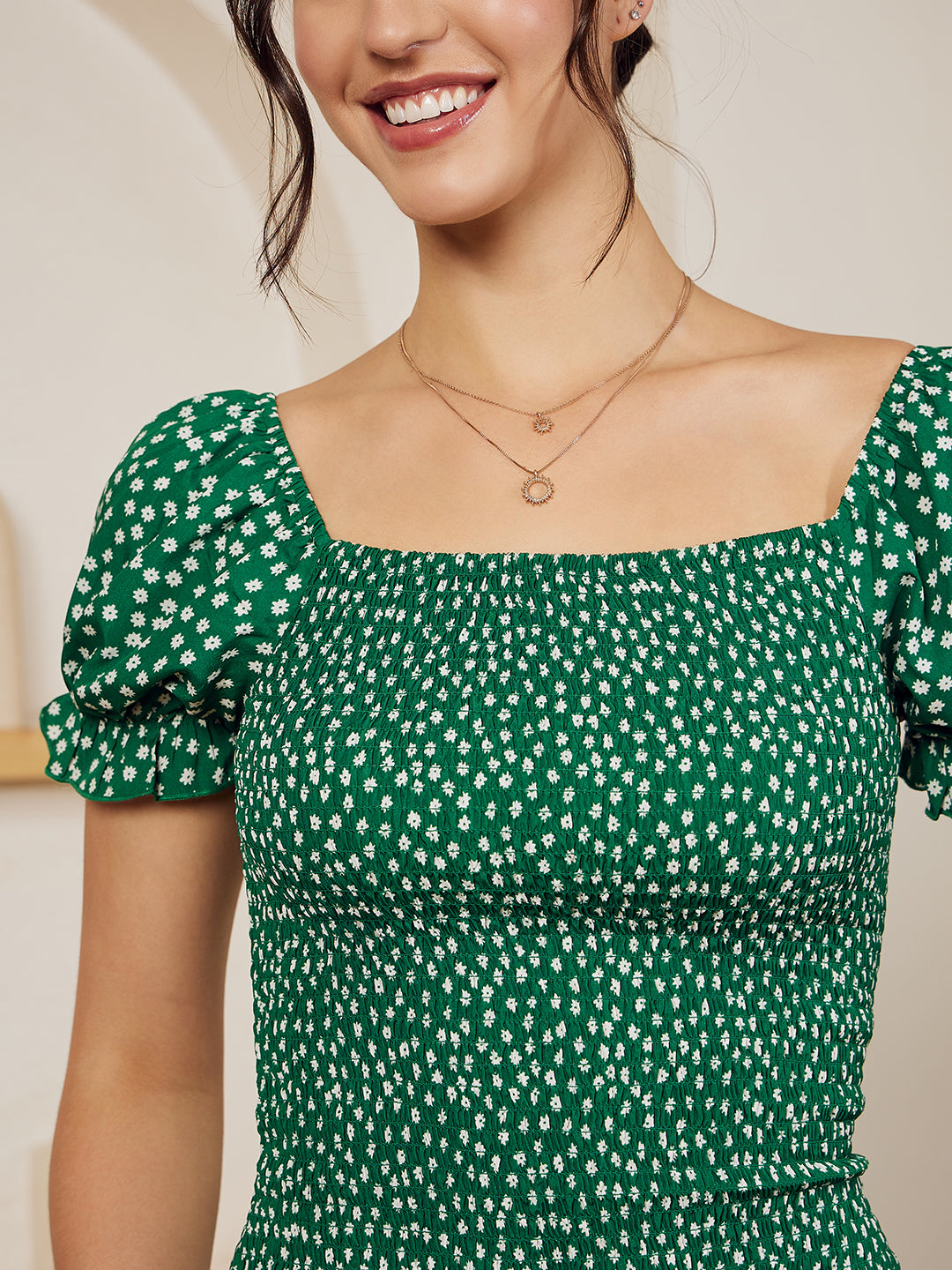 Introduce chic charm to your party closet with a twist of femininity by opting for this pretty Green & White Floral Printed Square Neck Crepe Straight Hem Pleated Bodycon Midi Dress designed by Berrylush for its latest dress collection. Adorned with a square neckline that gives this dress a unique yet adorable style note with an intimate appeal to your neck. Beautifully tailored in a bodycon shape that mimics an hourglass figure by lending this dress a body-hugging silhouette. The short-puffed sleeves offer your arms natural freedom of movement with a versatile fashion statement. Walk boldly in the upcoming party events by wearing this mini dress with a pair of silver high-heels, minimalistic jewellery, and a trendy sling bag.