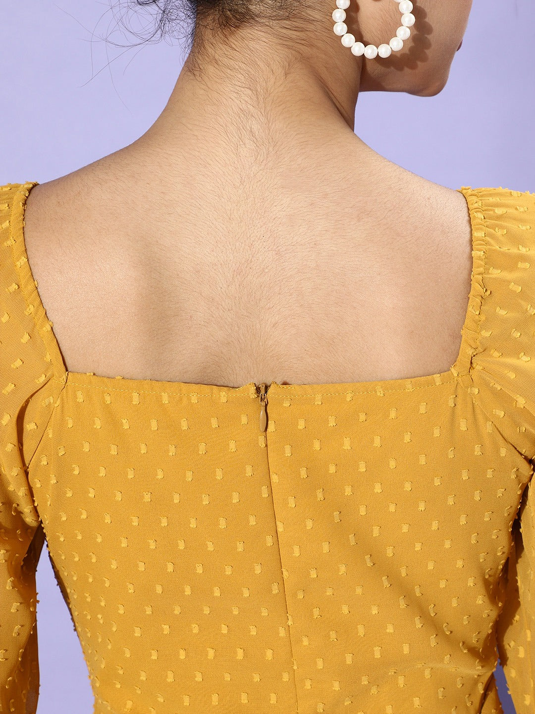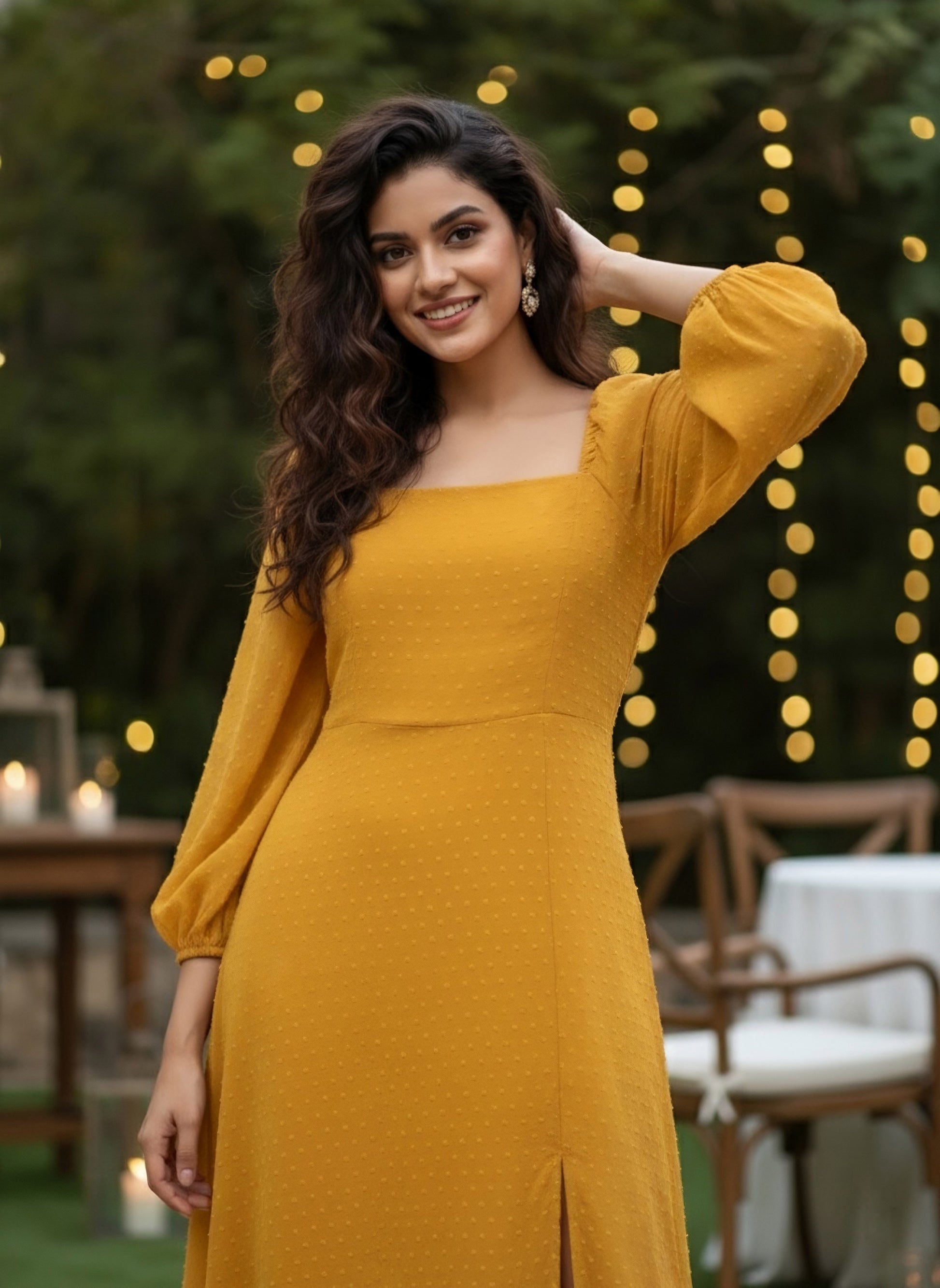 This party season enlivens your wardrobe with a refreshing, joyful, and exotic vibe with this stylish Mustard Yellow Self-Design Patterned Puff Sleeves Maxi Dress from the party wear collection introduced by Berrylush. This dress enables you to flaunt a range of personality traits such as passion, ambition, and calmness with its mustard shade while the self-design pattern of the dress depicts your artistic side. Elegantly crafted square neck design lends modish and classy definition to your beautiful neckline and the long-puff sleeves give your arms a glamourous texture. Complete the look by wearing this mesmerizing maxi dress with a pair of strappy heels, minimalistic silver jewellery, and a clutch to get an on-point feminine sophisticated party look.
