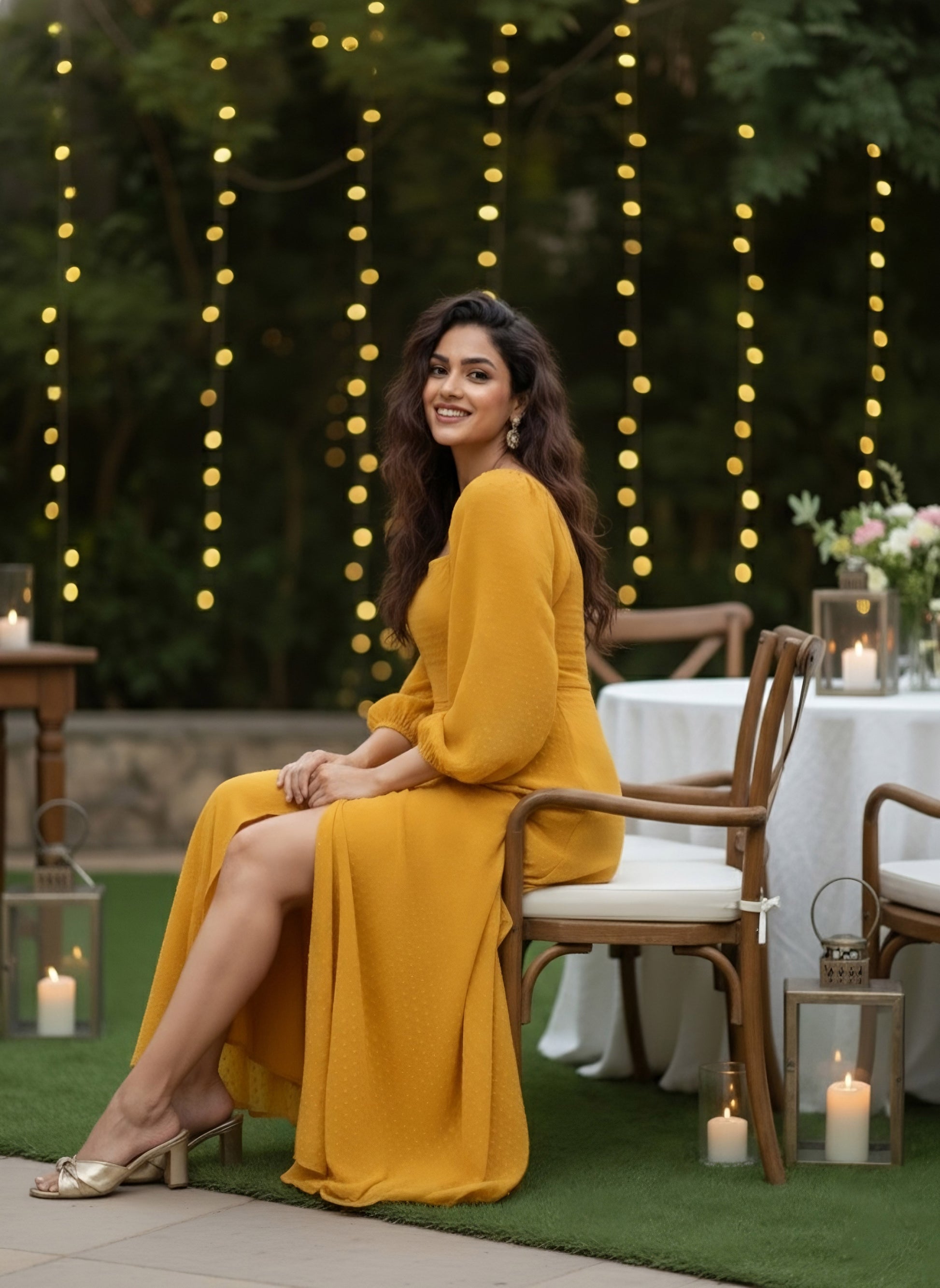 - Mustard yellow shade adjoin with self-design pattern gives away cinematic party vibe