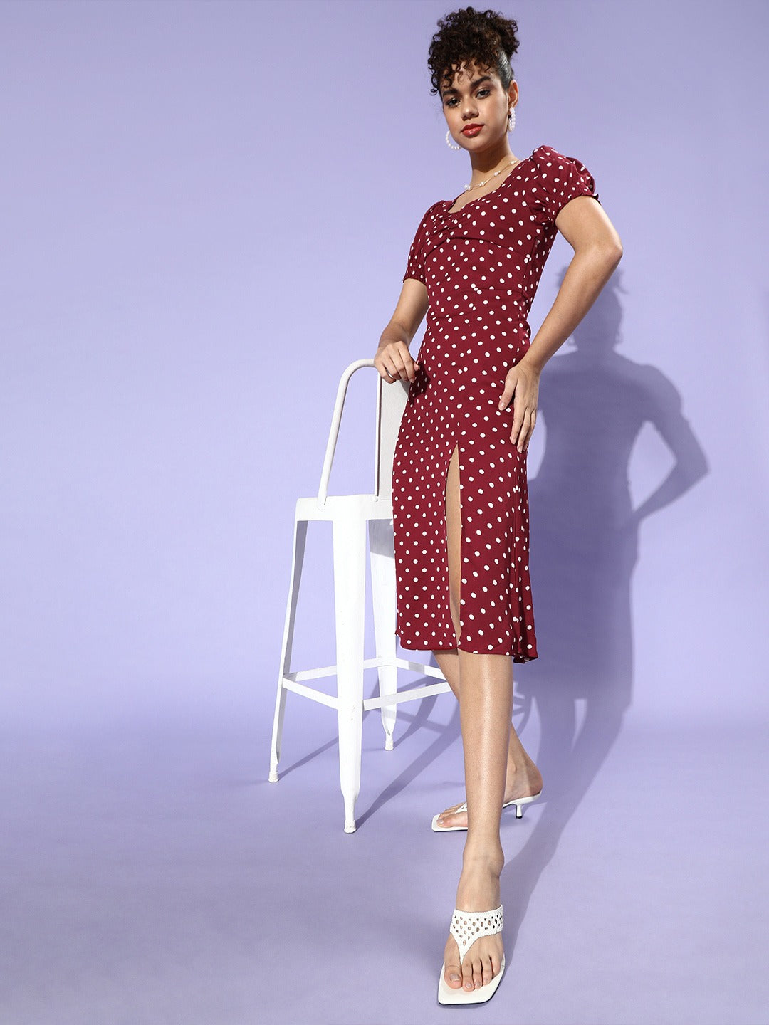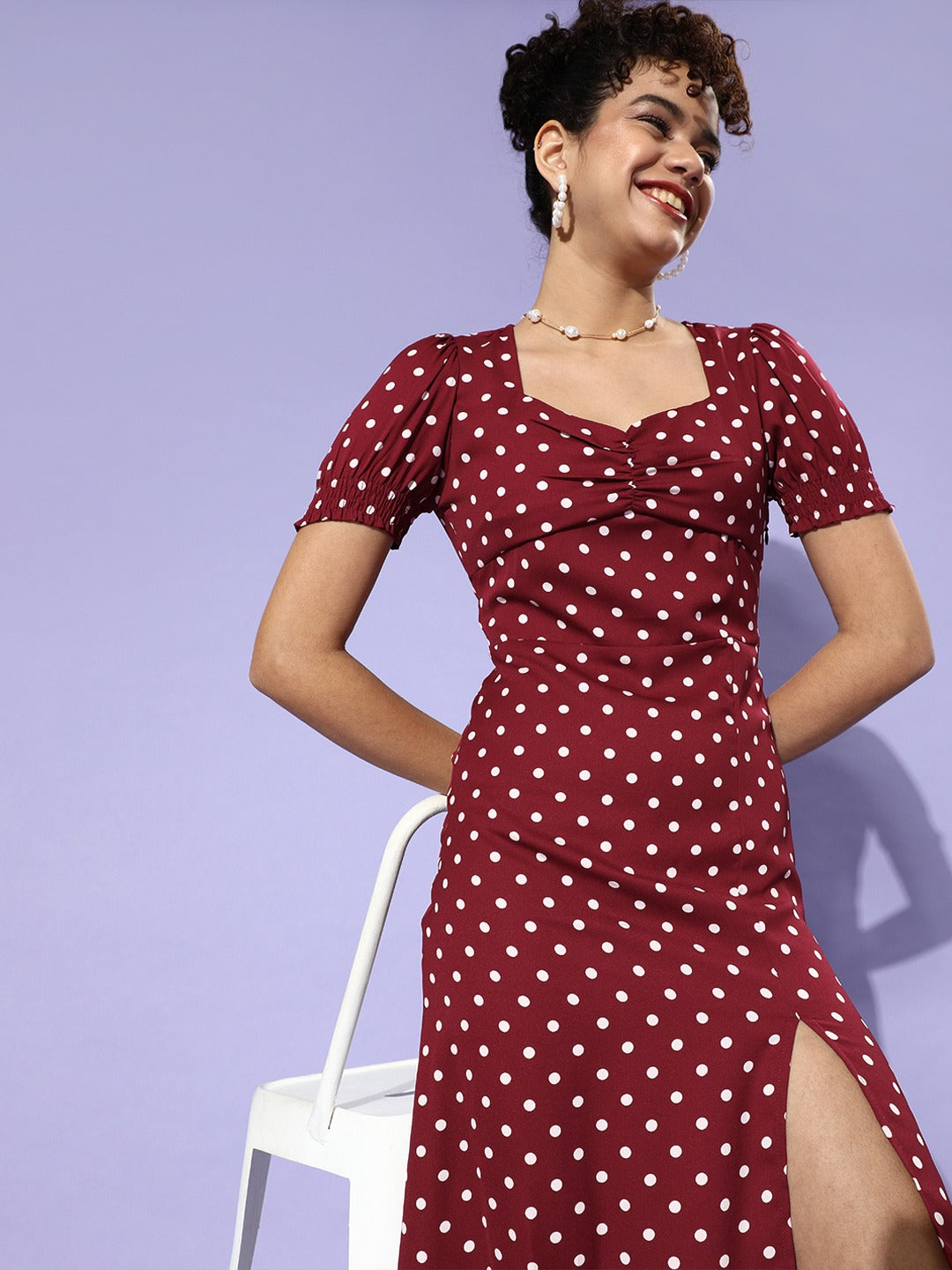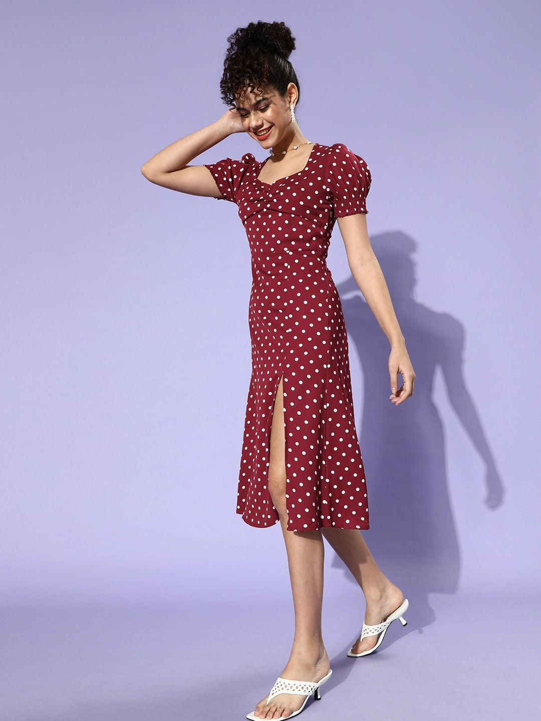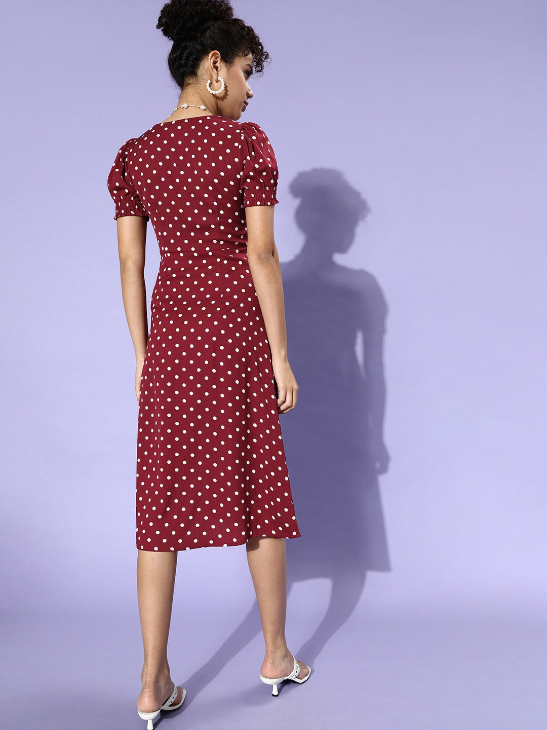Berrylush Women Red Polka Dot Printed Sweetheart Neck A-Line Midi Dress