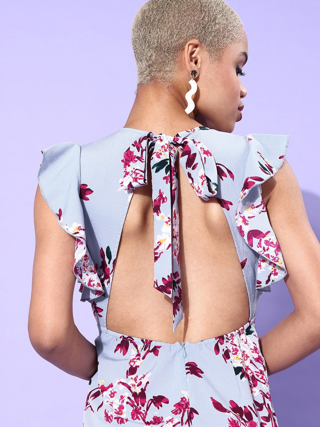 Show the world the colourful side of you with this Blue & Red Floral Printed A-Line Ruffled Mini Dress from Berrylush. The short flutter sleeves fill a more retro look to your arms and the V-shaped neckline adds a charming touch to your neck that ultimately making your torso appear amazing. With the allover floral print, this casual wear keeps your appearance soothing and relaxing to the eyes. The back tie-up knot along with the triangle cut out design fills this outfit with an immense modish element. Get the best look when you style this exotic mini dress with strappy heels and never miss to amaze people with the stylish outfits from Berrylush.