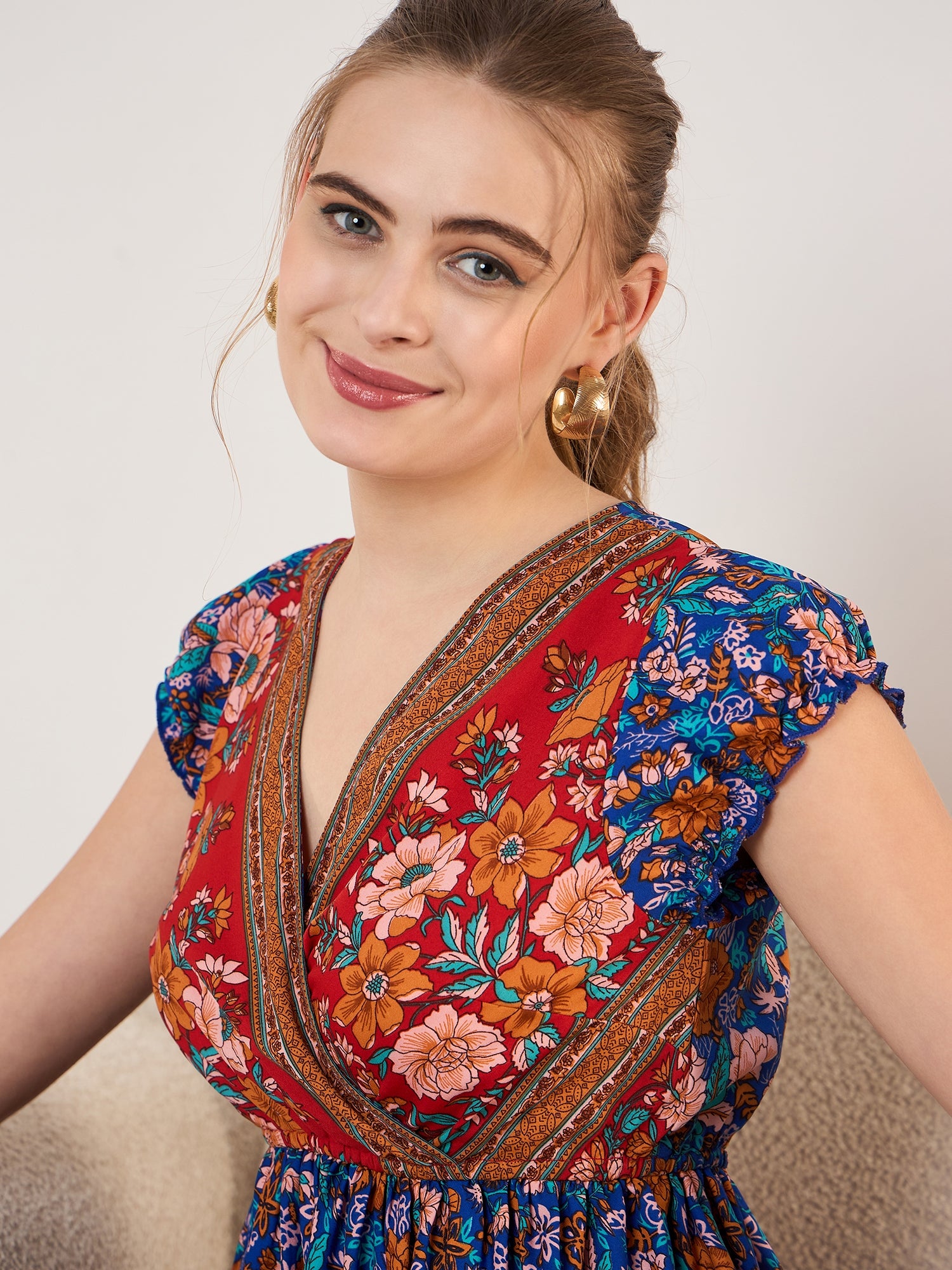 Introduce modernized and vibrant hues to your western wear closet with this stylish Blue & Red Floral Printed Fit & Flare Mini Dress from Berrylush. This dress would amp up your everyday look with its short puffed sleeves which add dignified texture to arms with proliferation movement. The fit and flare skirt elegantly highlight your natural curve and create a flaunting look. Spun from crepe polyester fabric to get your attire crispy touch with stain resistance while the woven detailing provides flexibility to your body. The bedazzling combination of blue and red floral print symbolizes a vintage and cinematic vibe while the mini length lends an exotic touch to your overall look. Wear this enticing mini dress with platform heels and a trendy clutch to get a fascinating outlook.