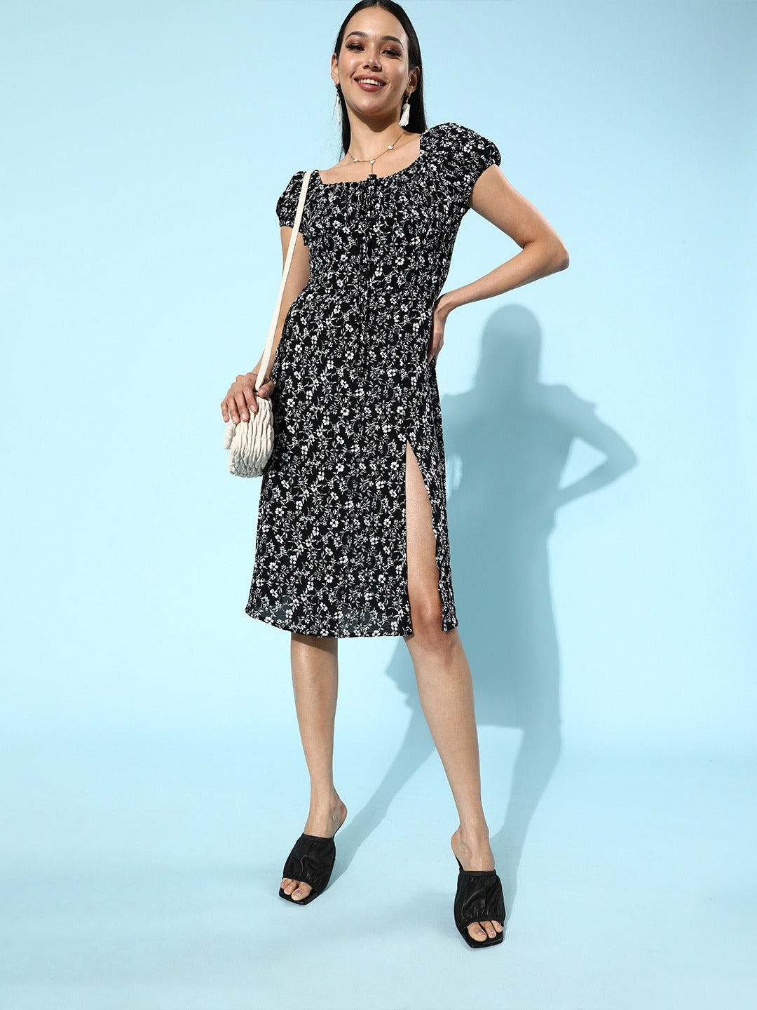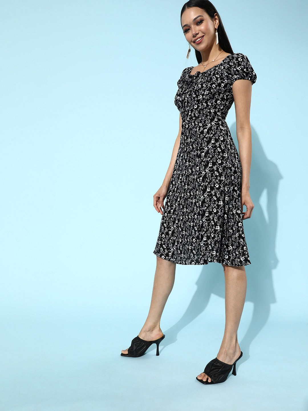 Berrylush Women Black Ditsy Floral Printed A-Line Flared Mini Dress