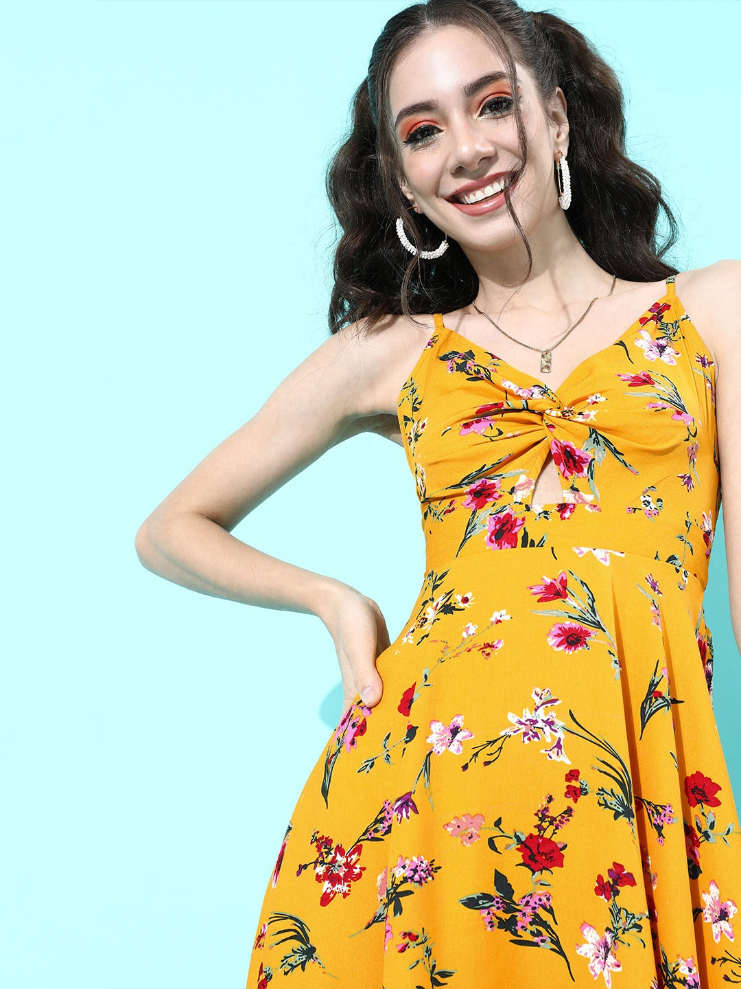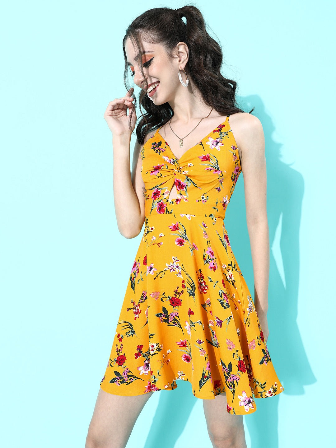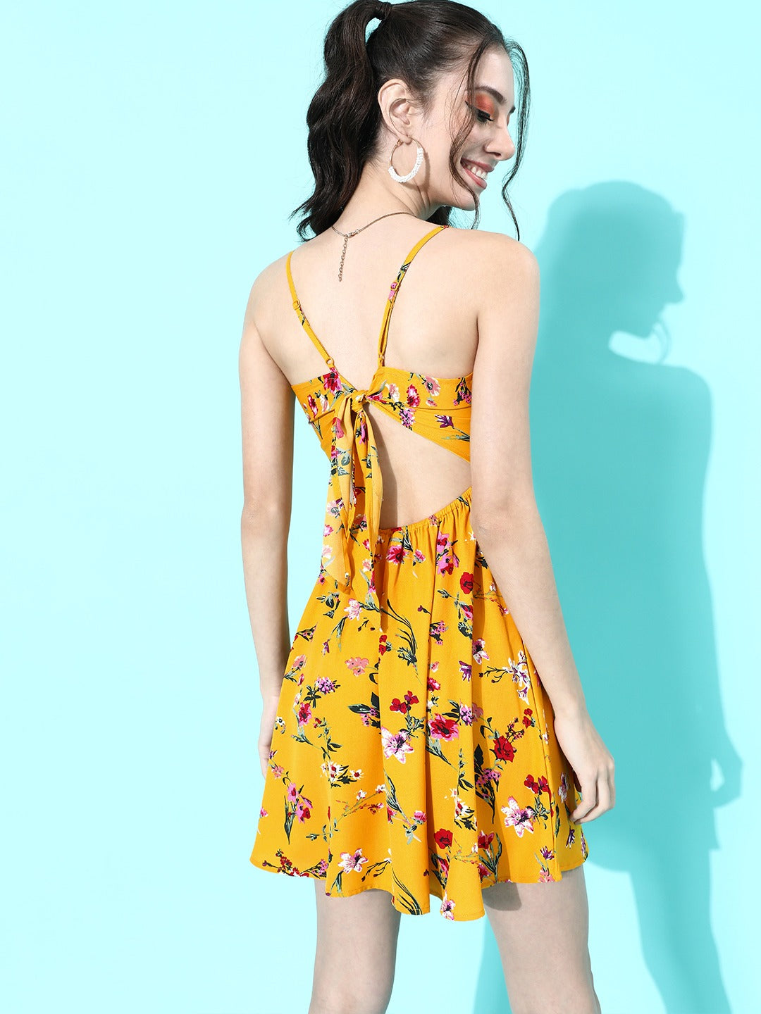 Berrylush Women Bright Yellow Floral Printed Back Tie-Up Fit & Flare Mini Dress