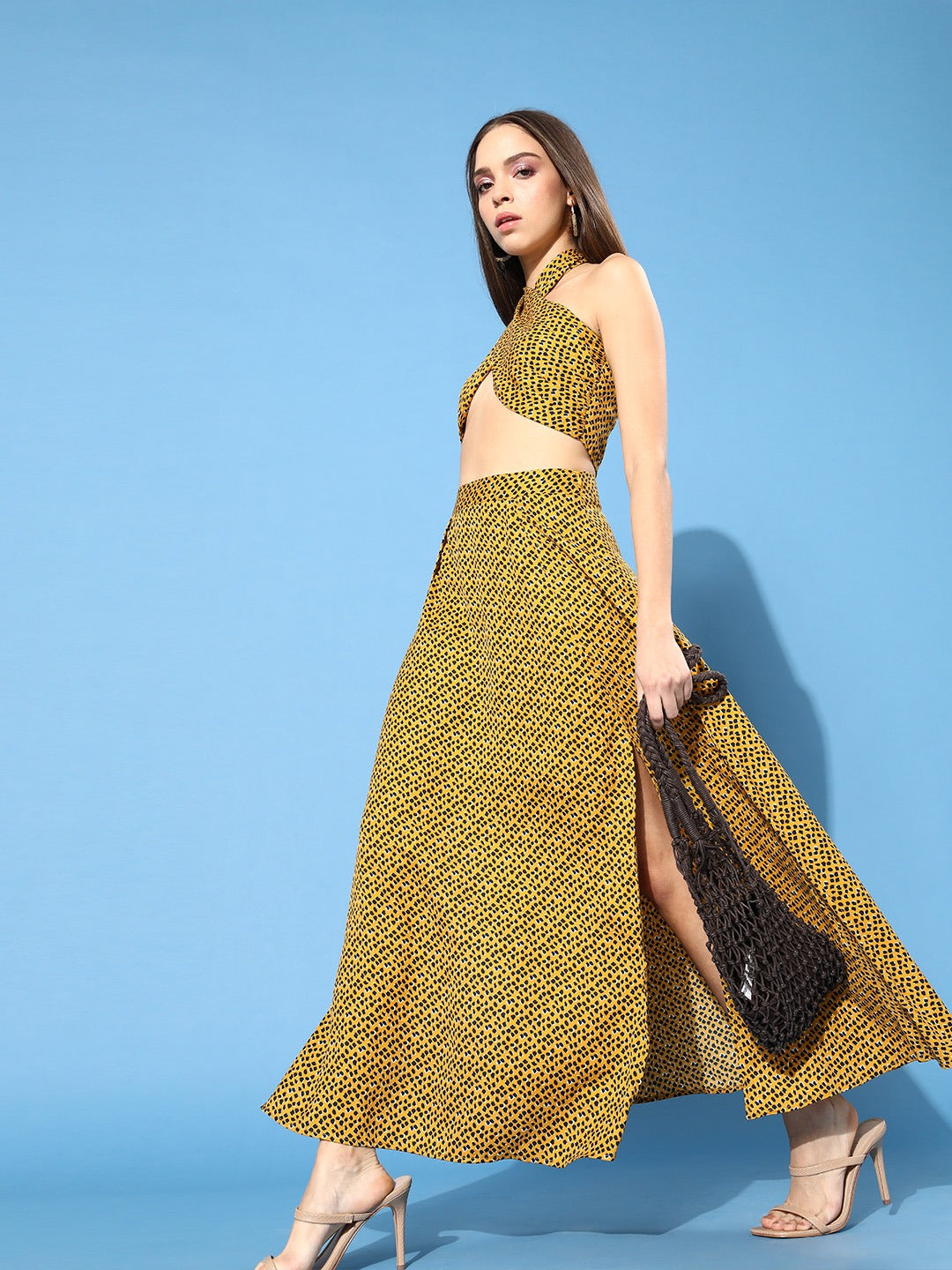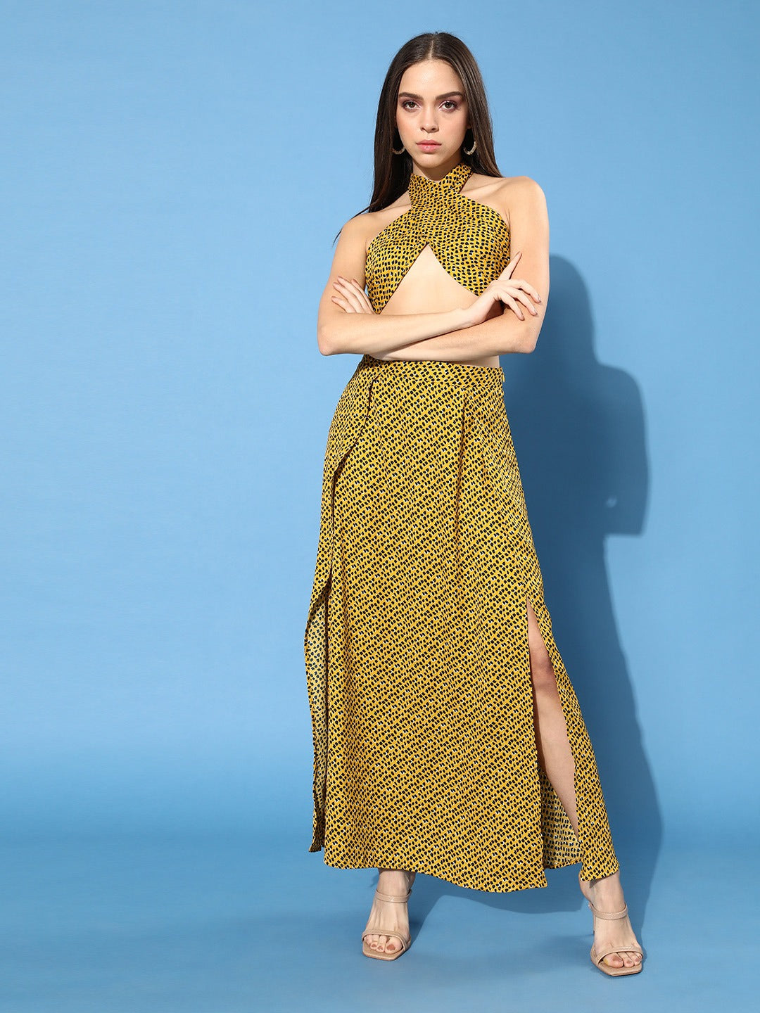 Inject a confident and free-spirited feel to your casual collection with this cinematic Yellow & Black Animal Printed Halter Neck Crepe Maxi Dress from Berrylush. This dress is sure to get you a powerful and fashion-forward look with the amazing combination of yellow and black shade with animal print presenting the illustration of leopard essence from your casual outlook. Designed with halter neck and cut-outs detailing giving out an eccentric and exotic vibe while the flared hemline adjoins with thigh slit gives a fascinating and glistening sheen to your beautiful legs. The tie-up details of the maxi dress present your back part in an alluring and striking way. You can complete the look by teaming up this maxi dress with your favourite pair of high heels and a black side bag to create an enchanting final look.