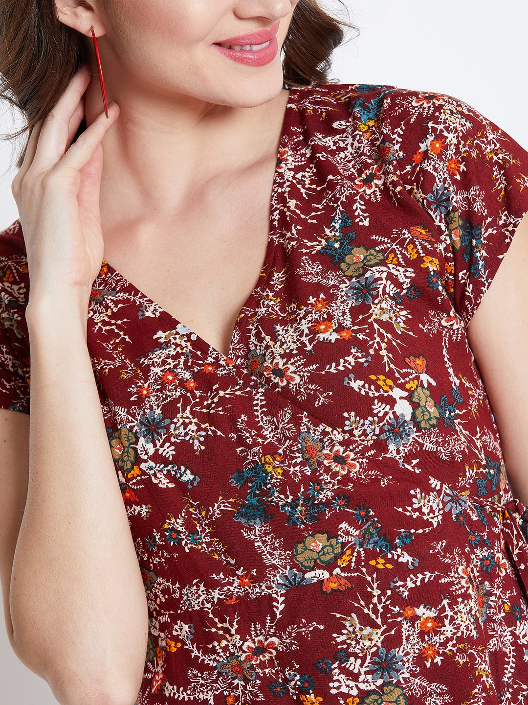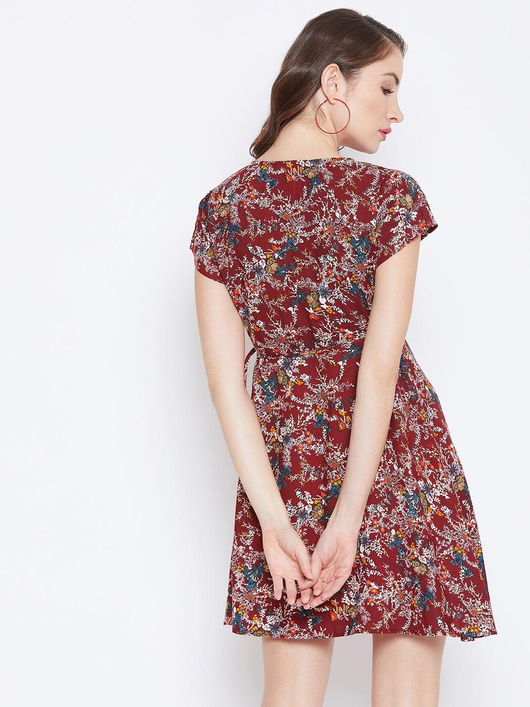 Berrylush Women Maroon & White Floral Printed V-Neck Tie-Up Waist Wrap Mini Dress