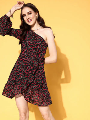 Berrylush Women Black & Red Floral Printed One-Shoulder Neck Tulip Ruffled A-Line Mini Dress
