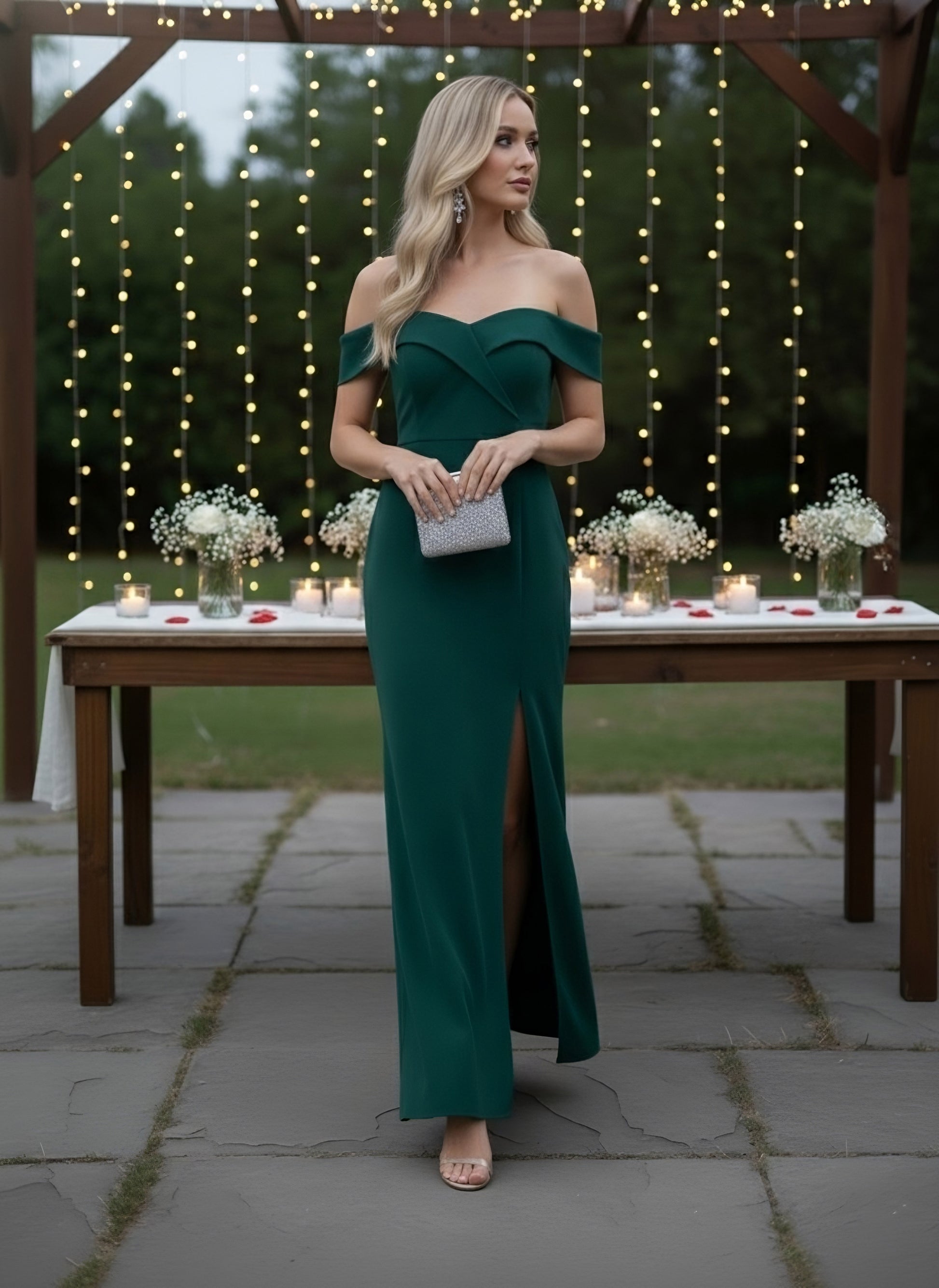 Berrylush Women Solid Green Off-Shoulder Neck Crepe Thigh-High Slit Flared A-Line Maxi Dress