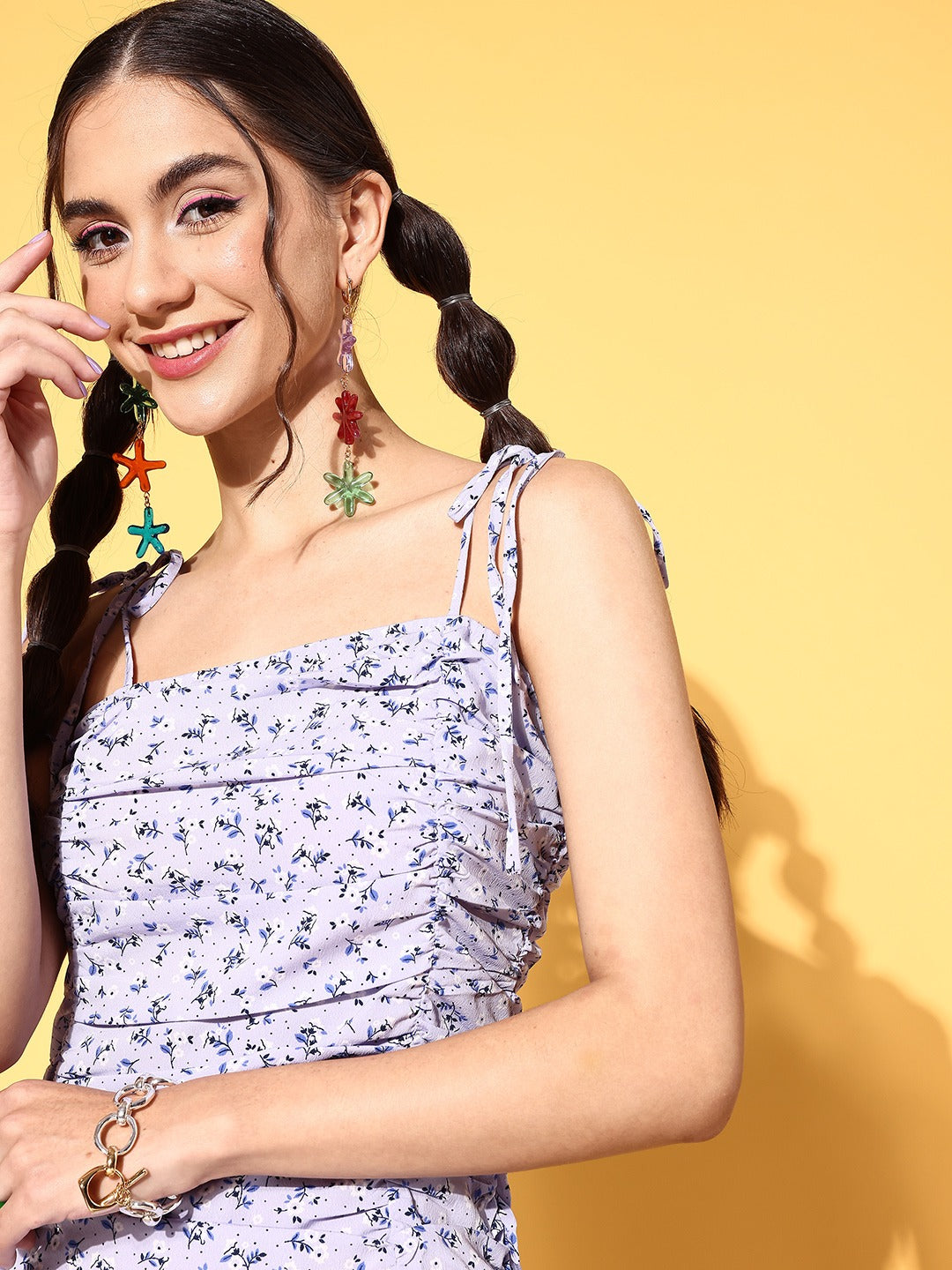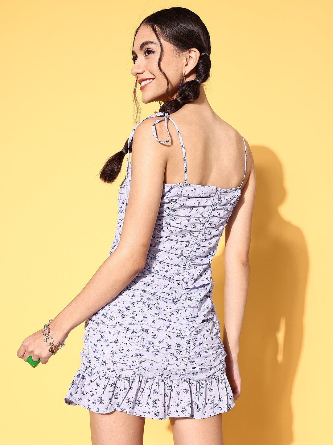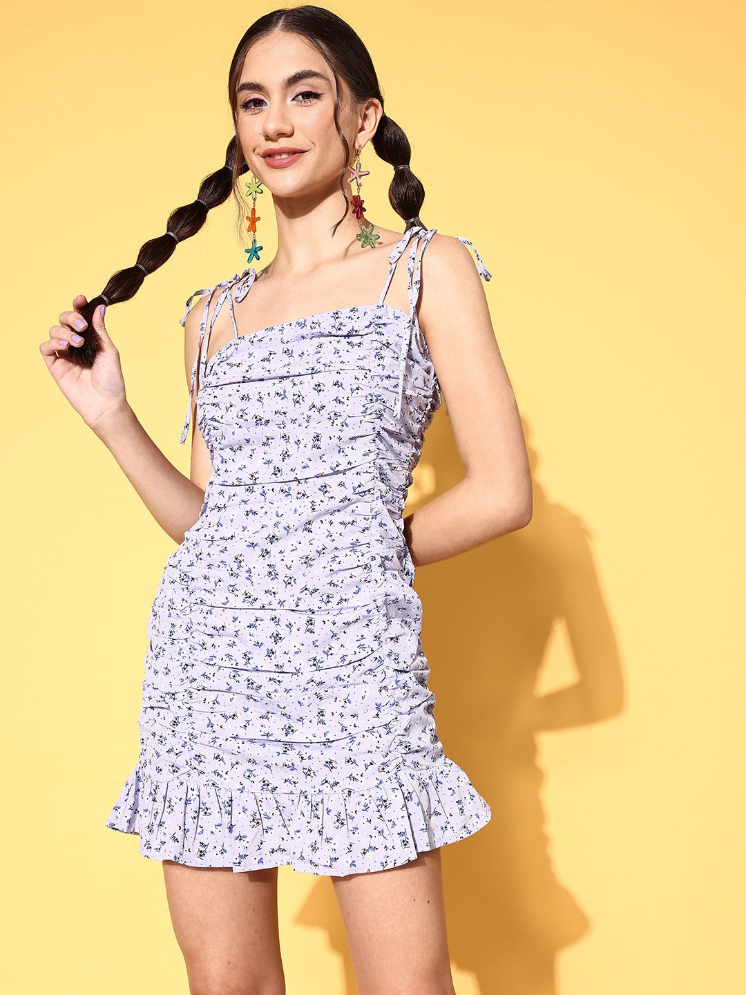Berrylush Women Lavender Floral Printed Square Neck Tie-Up Strap Crepe Ruched Bodycon Mini Dress