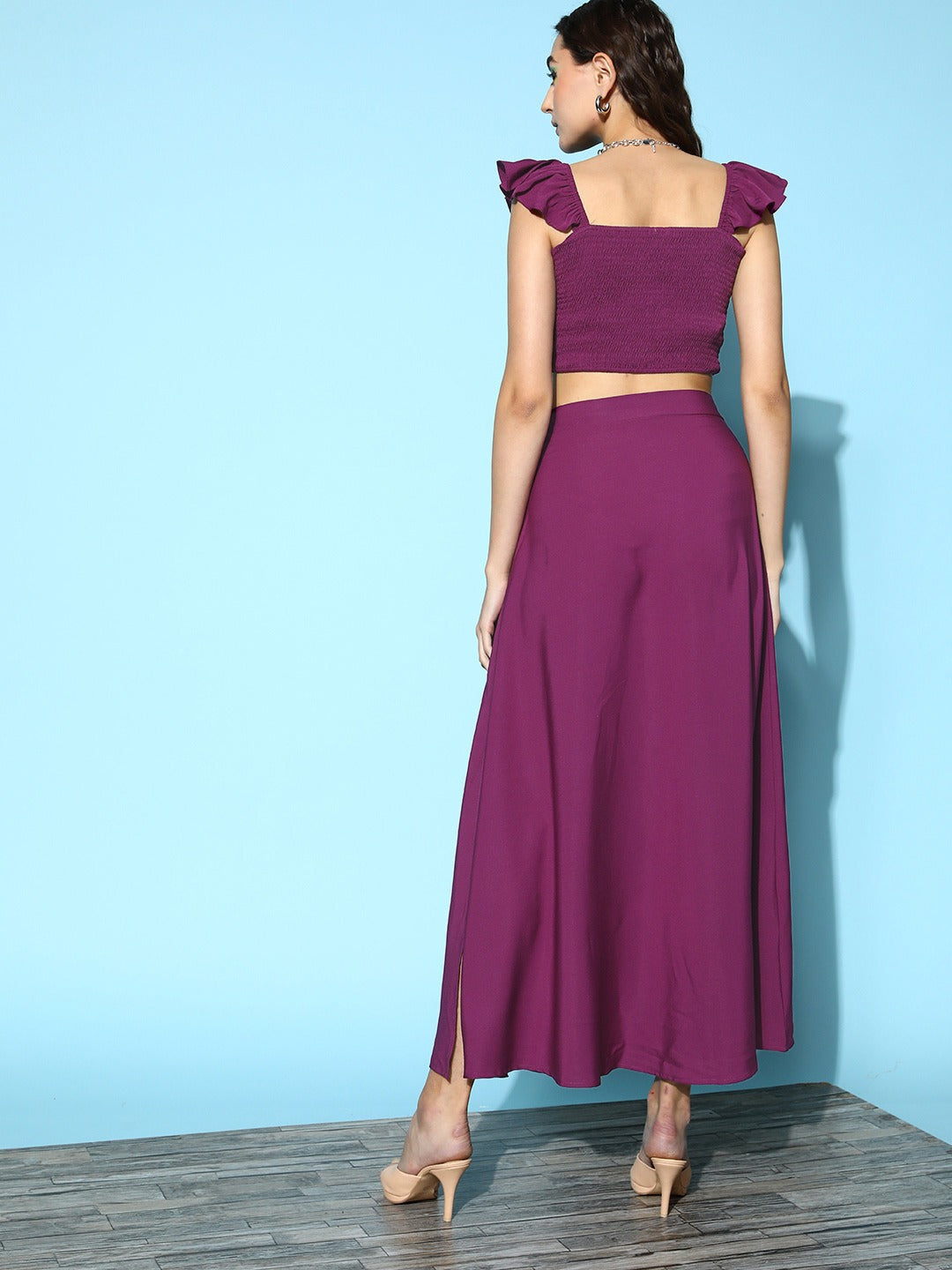 Berrylush Women Solid Purple Square Neck Smocked Crop Top & Maxi Skirt Co-Ord Set