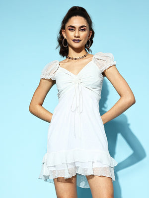 Berrylush Women Solid White Dobby Weave Sweetheart Neck Georgette Flounce Hem Ruffled A-Line Mini Dress