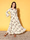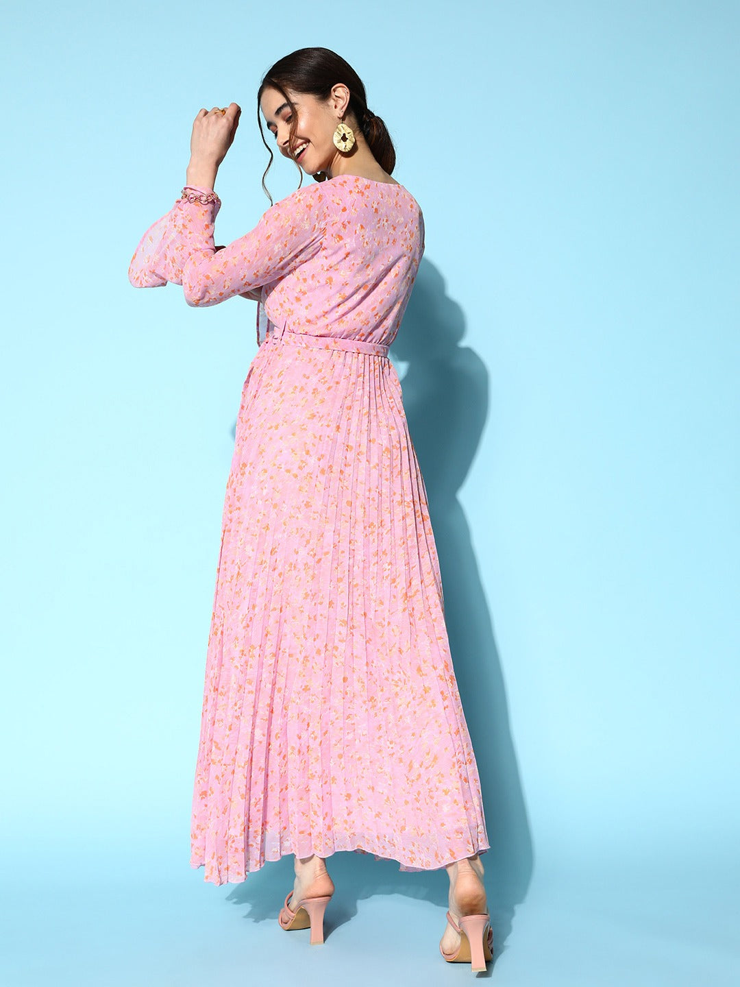 Berrylush Women Pink Floral Printed Self Tie Pleated Bell Sleeves Georgette Maxi Dress