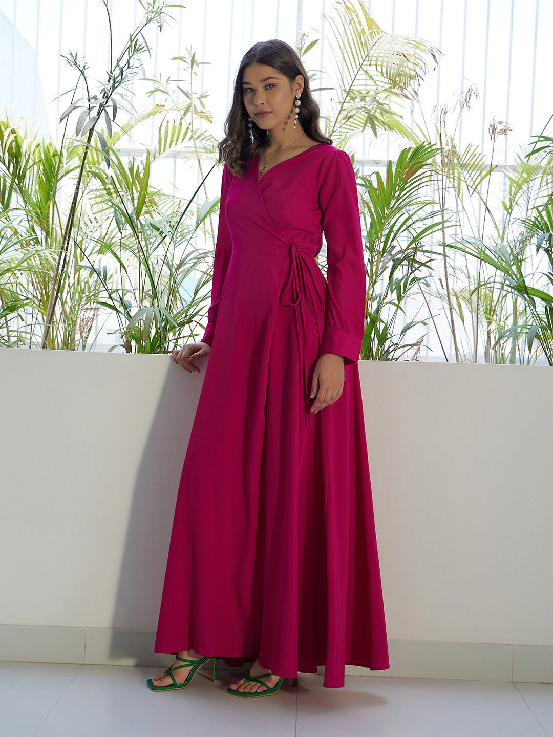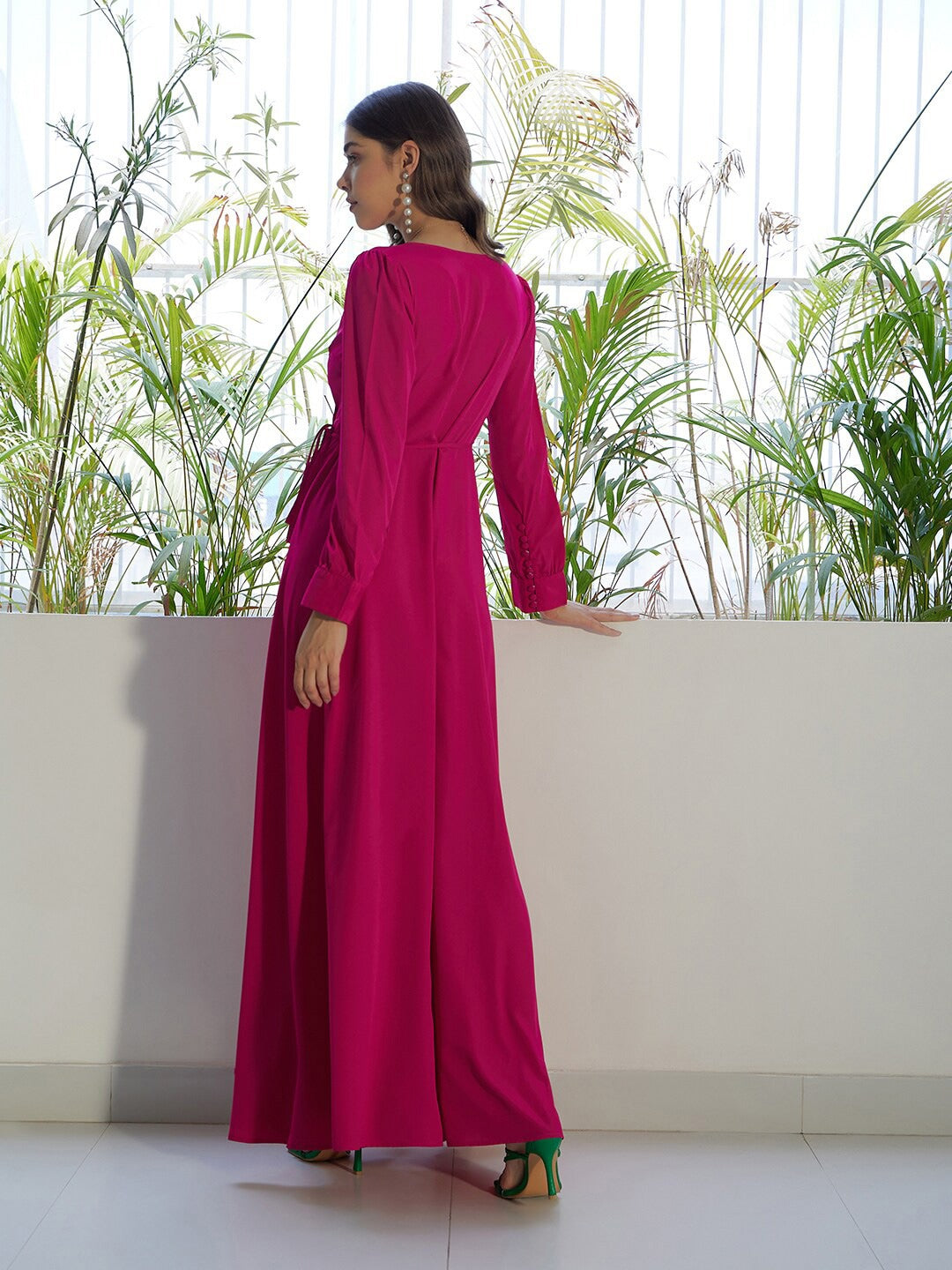 Berrylush Women Solid Pink V-Neck Cuffed Sleeves Waist Tie-Up Thigh-High Slit Flared Maxi Dress