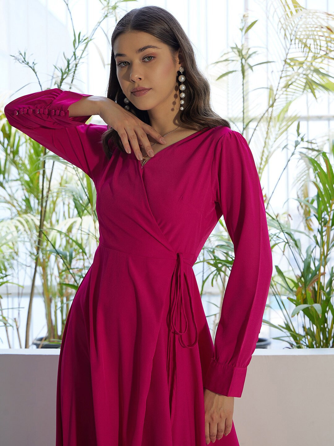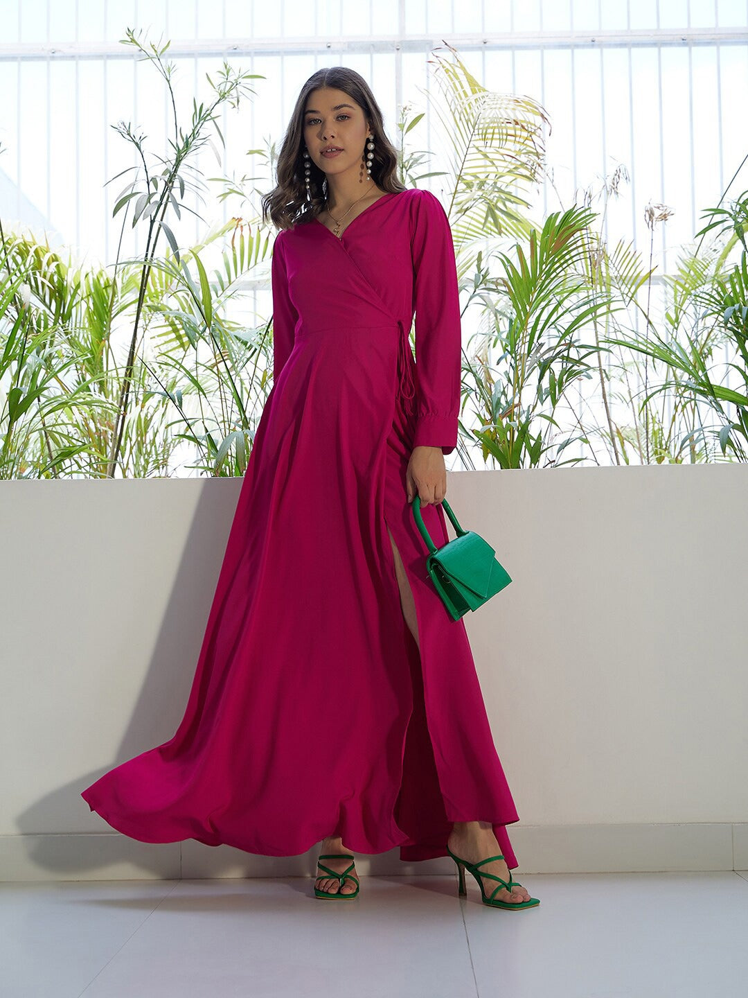 Charm up your casual closet with voguish stylish essence just like this stunning Solid Pink V-Neck Cuffed Sleeves Waist Tie-Up Thigh-High Slit Flared Maxi Dress from Berrylush. Rendered from high-quality polyester material that gives this dress a super soft texture along with excellent moisture-wicking properties. The duo of pink shade and a solid pattern presents a cinematic amalgam that brightens your look with a joyous vibe. Moreover, the pleated surface styling injects additional flair and volume into this maxi dress. You can wear this beautiful maxi dress with a pair of stylish high-heels, hoop earrings, and a trendy handbag to create an enchanting appearance.