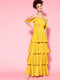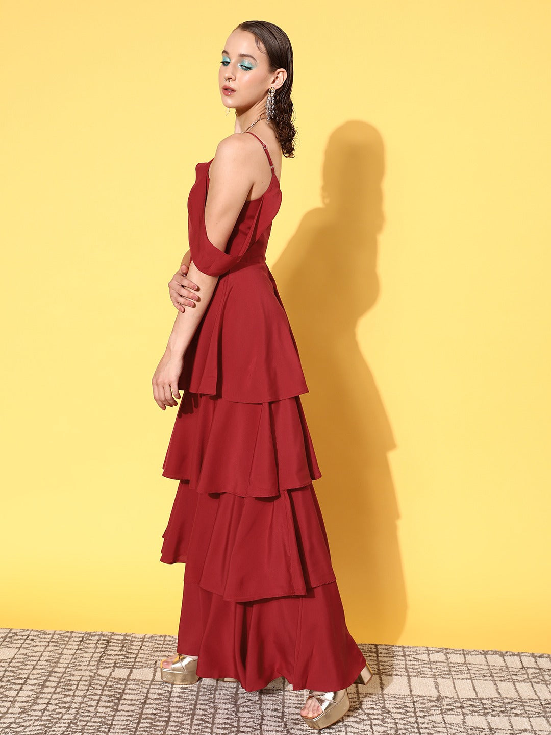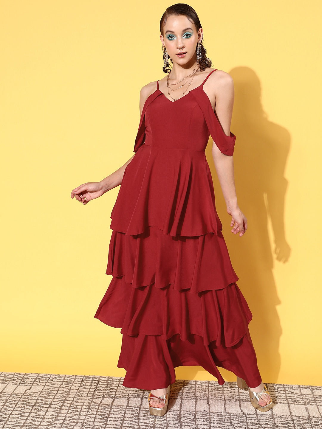 Berrylush Women Solid Maroon V-Neck Cold-Shoulder Flounce Hem Layered A-Line Maxi Dress