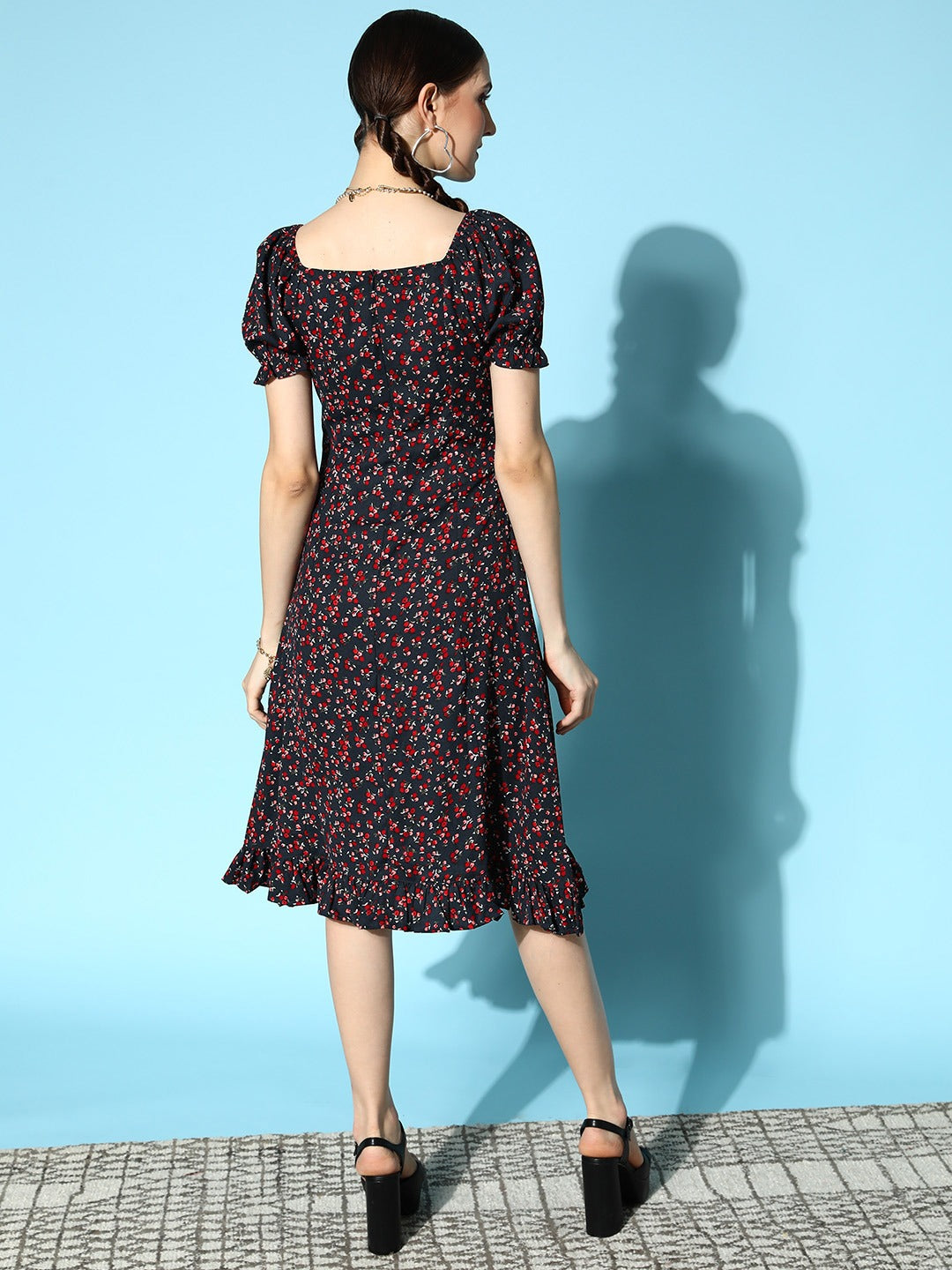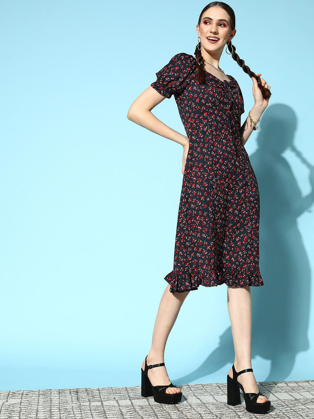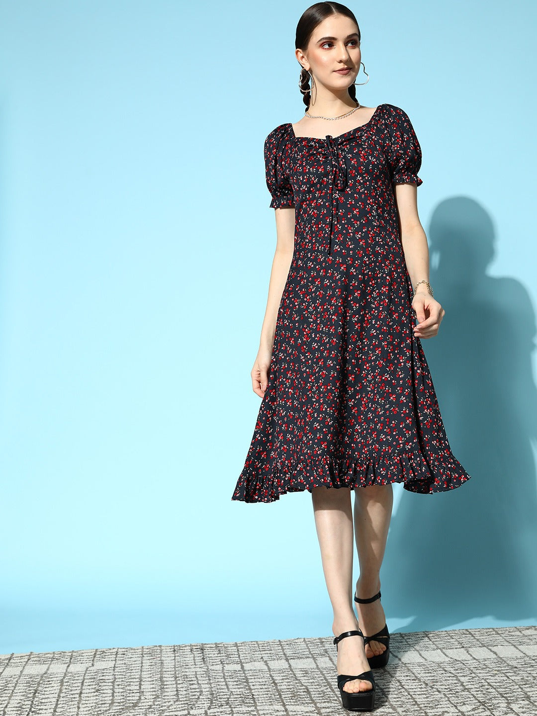 Berrylush Women Navy Blue & Red Floral Printed Tie-Up Neck Flounce Hem Pleated A-Line Midi Dress