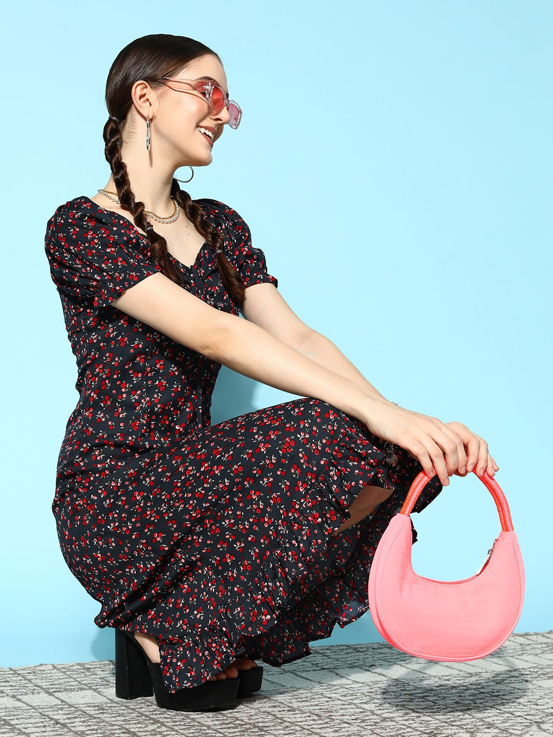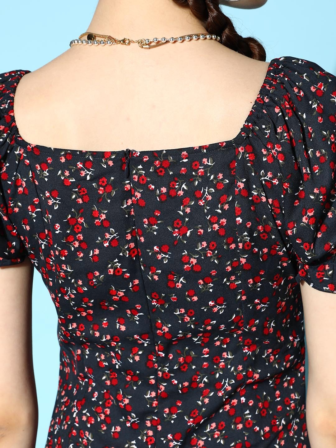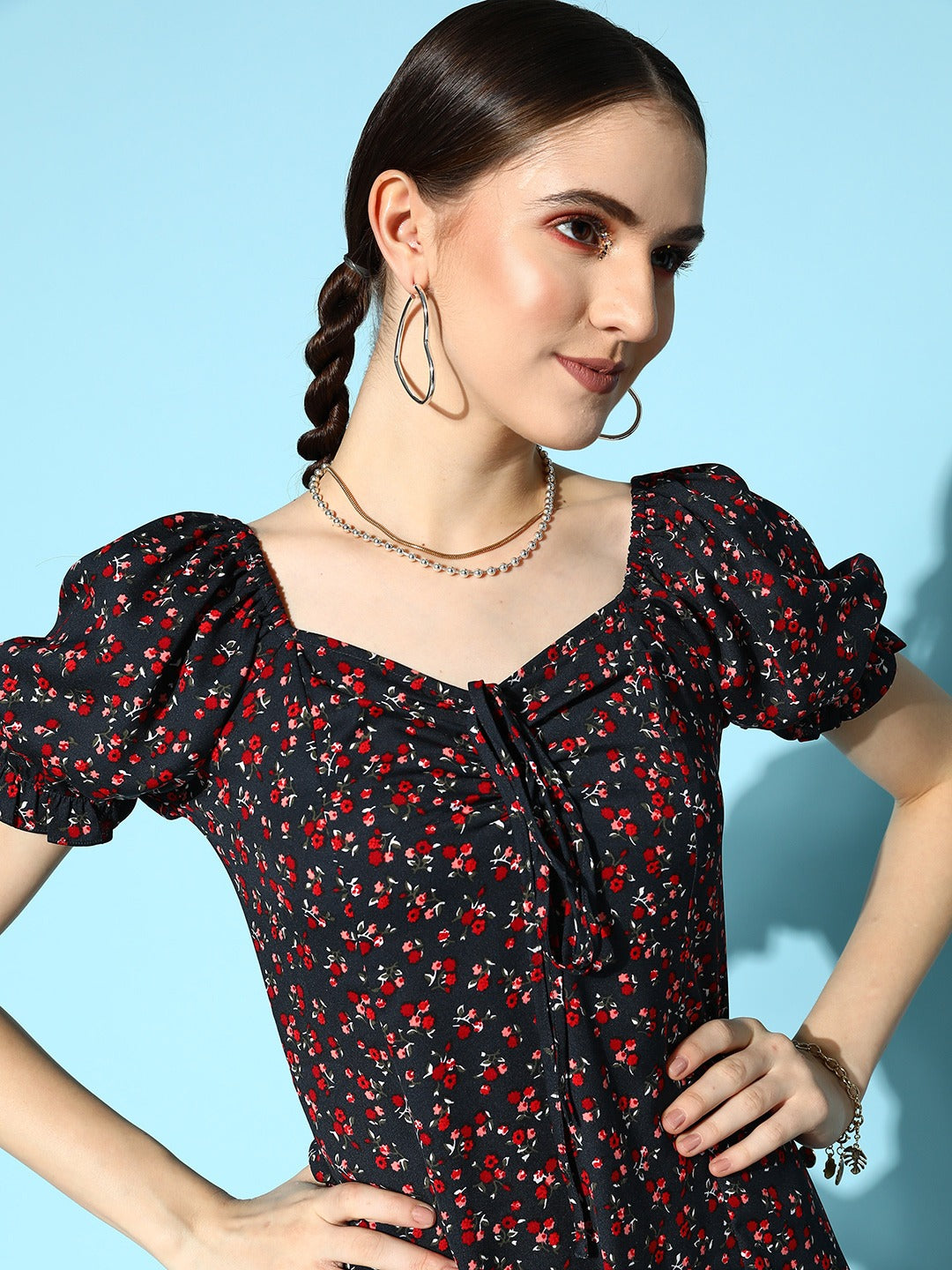 Berrylush Women Navy Blue & Red Floral Printed Tie-Up Neck Flounce Hem Pleated A-Line Midi Dress