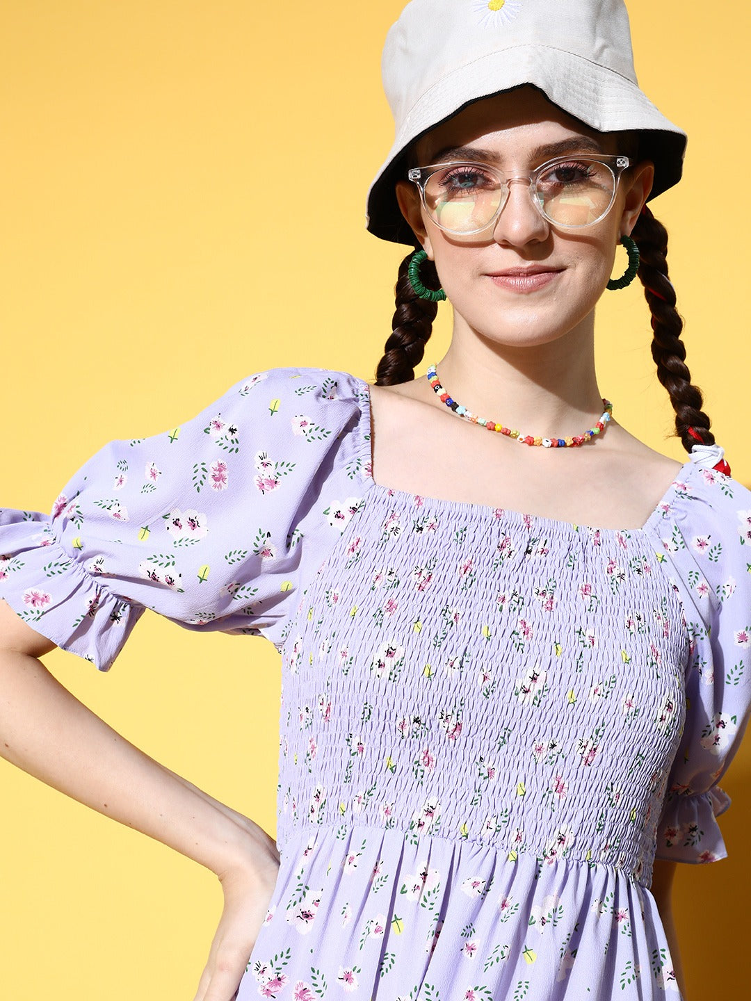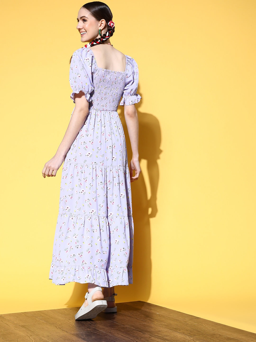 Upgrade your everyday laid-back look to a magnificent one with this lovely Lavender and White Floral Print Crepe Maxi Dress from the latest floral print collection of Berrylush. This dress is a timeless piece for your wardrobe as its square neck design gives your neckline a broad and sophisticated appeal. Styled with short-puff sleeves that adjoin a periodical charm to this dress with an enchanting coverage to your arms. Milled from crepe polyester fabric to lend this dress astonishing moisture-absorbing feature with an anti-abrasion feature. Look stunning while attending a family picnic by wearing this maxi dress with flat sandals, matching jewellery, and a tote bag.