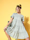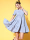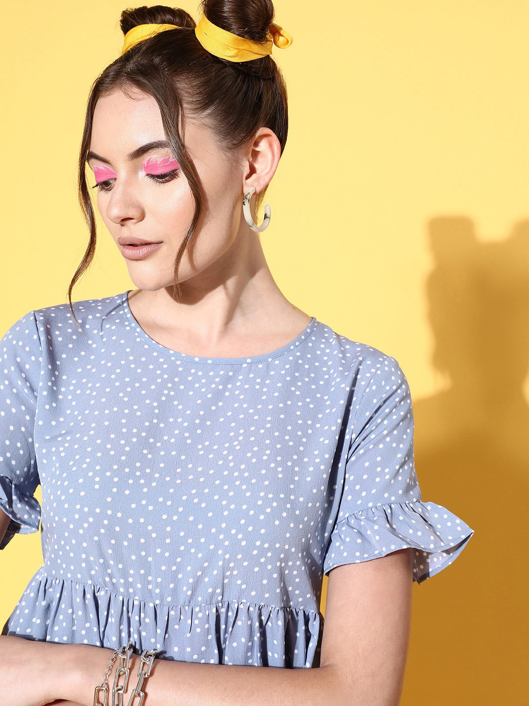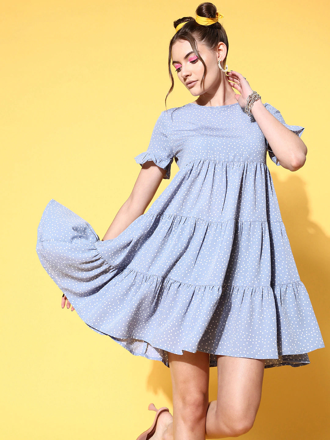 Berrylush Women Blue & White Polka Dot Printed Round Neck Crepe Flounce Hem Pleated A-Line Mini Dress