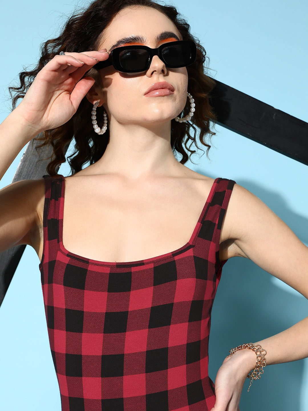 Unwrap a popping and versatile style accent that keeps your closet fashionable all around the year with this ravishing Red & Black Checked Print Square Neck Crepe Straight Hem Bodycon Mini Dress from Berrylush. Presenting a sleeveless design that gives an eccentric outshine to your beautiful arms and shoulders. Designed with a red and black checked pattern that illustrates an aesthetic design with a monotonous vibe. A straight hemline elegantly outlines your curves and assembles your sexy casual appearance. Spun from crepe polyester fabric to support stain resistance with amazing sweat-wicking attributes. Get ready in a fabulous way for the Christmas party by pairing this mini dress with an overcoat, black knee-length boots, and a sassy red bag.