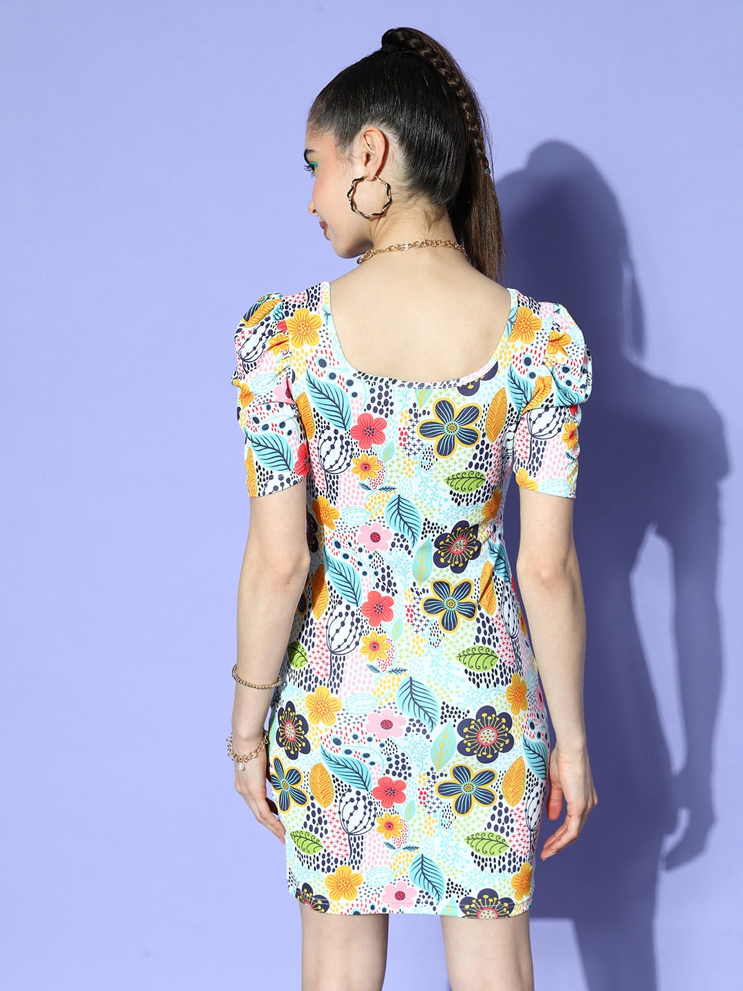 Express your cheerful person with your refreshing style statement by donning this beautiful White and Blue Floral Print Crepe Straight Mini Dress from the latest summer wear collection of Berrylush. Presents a charismatic amalgam of white and blue floral print that gives this dress a chic appearance with a hint of nature's beauty. Showing off short-puffed sleeves that offer your arms appropriate exposure with a tinge of retro style. Also, the straight hemline lends this dress a contouring silhouette and sleek finish with seamless stitching. Look fabulous on your way out from home with a partner this mini dress with a pair of block heels, cute tassel earrings, and a sassy side bag.