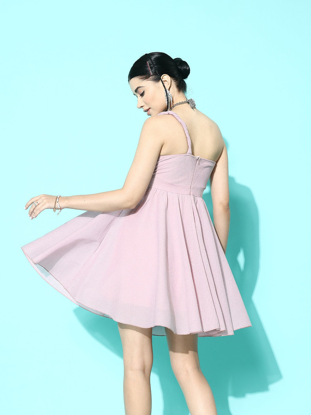 Berrylush Women Solid Pink One-Shoulder Neck Sleeveless Net Pleated Fit & Flare Mini Dress