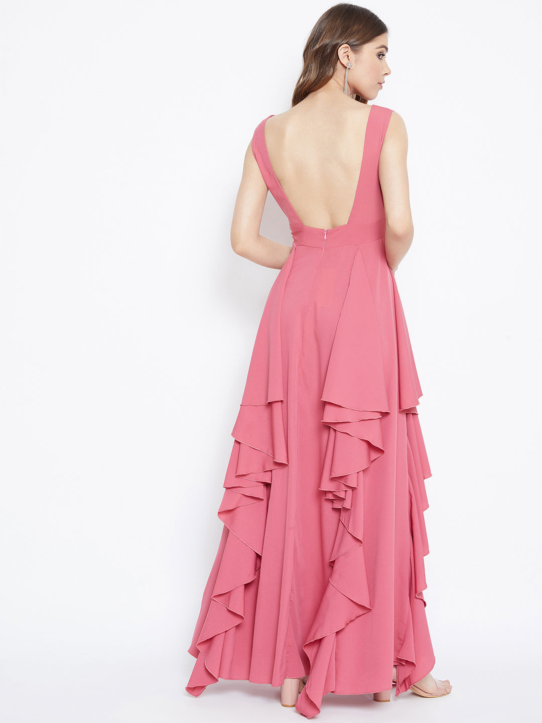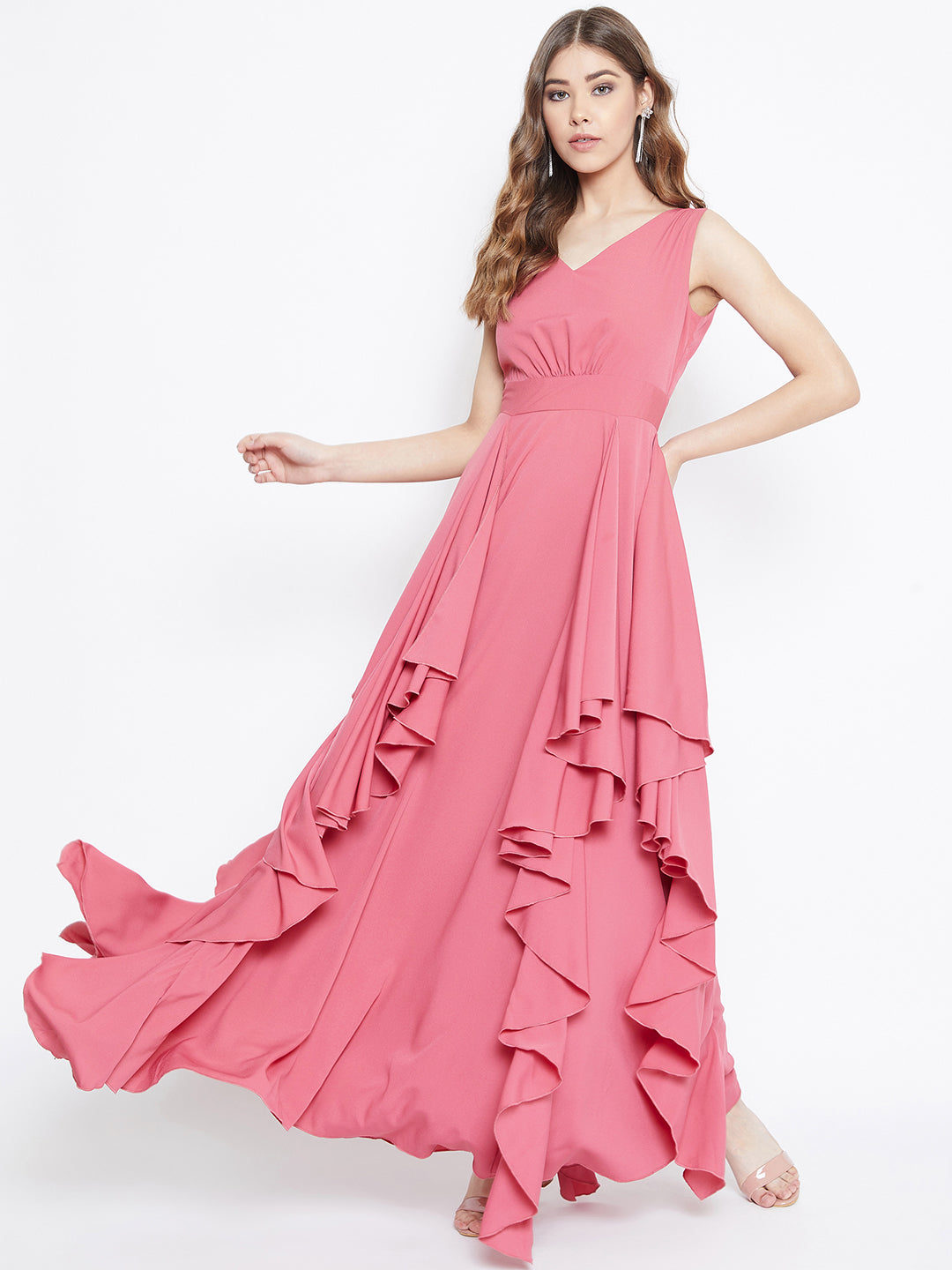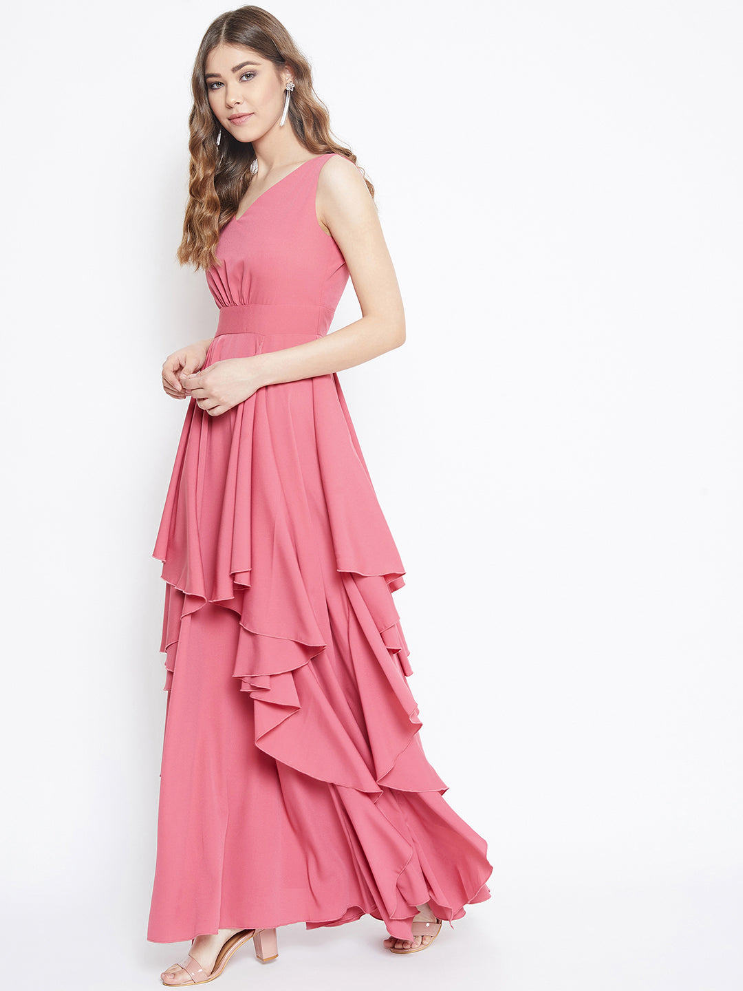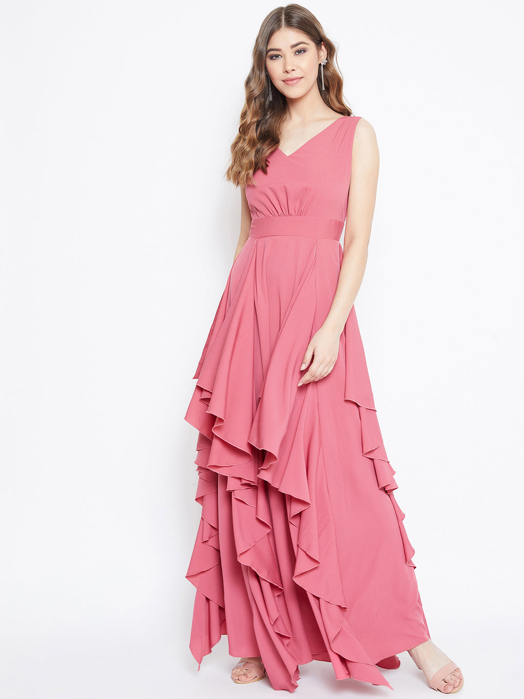 Inject charismatic volume to your partywear wardrobe with flattering outshine with this warm Solid Pink V-Neck Sleeveless Fit & Flare Maxi Dress from the party wear collection launched by Berrylush. Fashioned with fit & flare shape to give figure-flaunting appeal to your natural curve along with attached flair on the lower body portion while the V-neck design gives an alluring highlight to your beautiful neckline. The amazing combination of pink with solid pattern depicts your passionate side with a classy sheen and the concealed zip closure offers an easy-wearing feature with a contouring sheen. You can complete the party look by pairing this charming maxi dress with a pair of high-heels, minimalistic silver jewellery, and a sling bag to create a stunning outlook.
