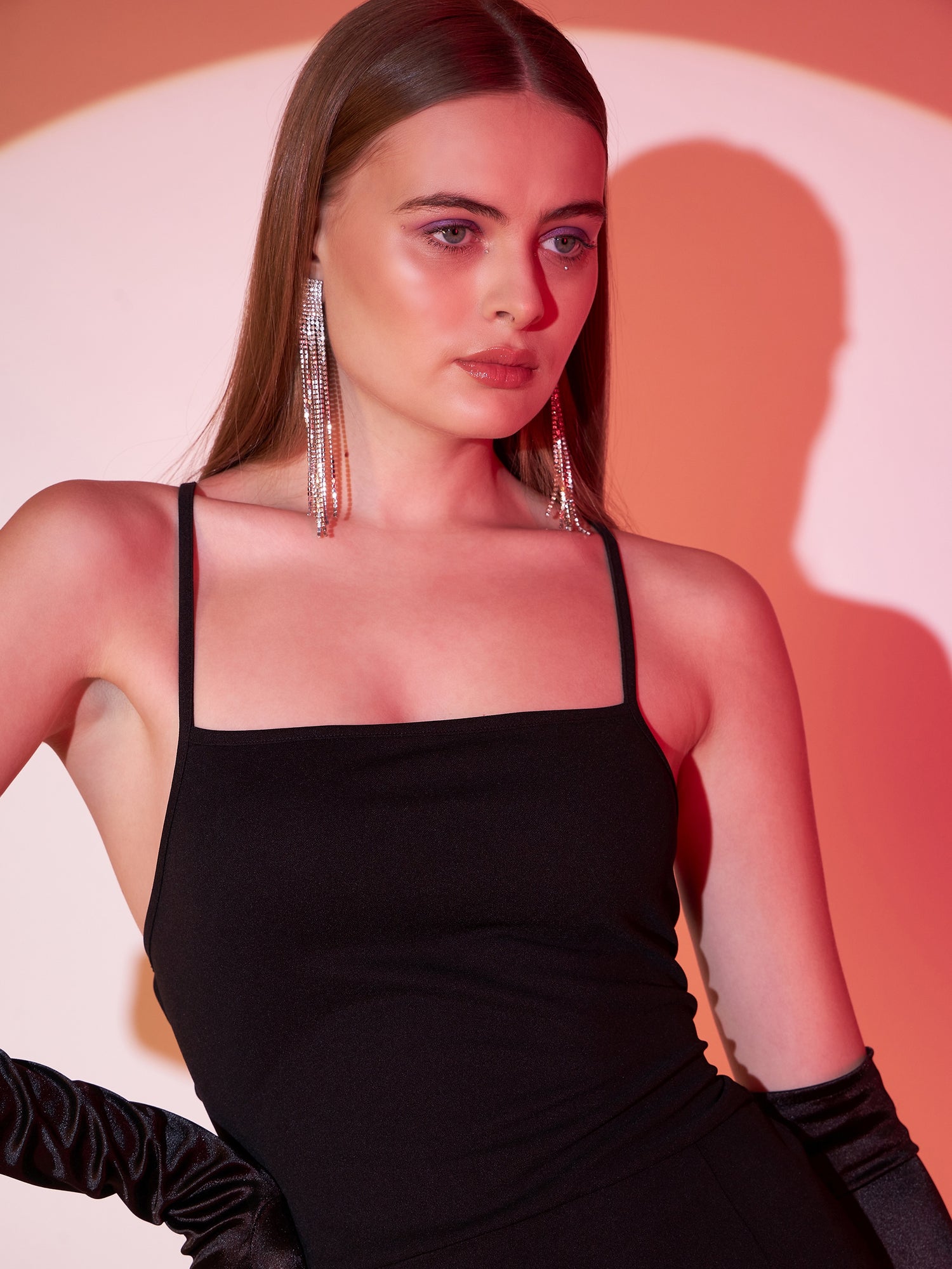 Step into the spotlight with Berrylush's Solid Black Bodycon Maxi Dress, perfect for any party scene. This sophisticated ensemble features a square neckline and sleeveless design that elegantly frames your collarbones. Crafted from smooth polyester with a knitted weave, it offers both comfort and style. The backless detail with a chic tie-up closure adds an alluring touch, while the thigh-high slit ensures you move effortlessly throughout your evening of enchantment. Finished with a straight hemline for sleek appeal, this opaque dress is designed to make you feel confidently beautiful.