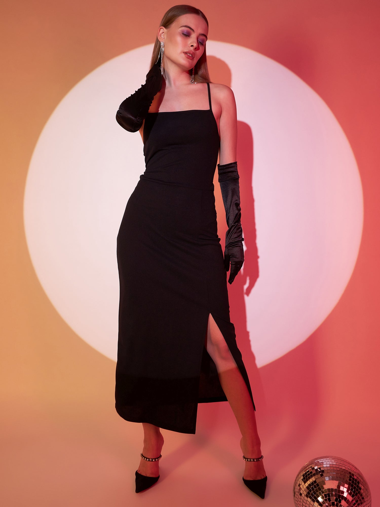 Berrylush Women Solid Black Square Neck Backless Tie-Up Thigh-High Slit Straight Hem Knitted Bodycon Maxi Dress