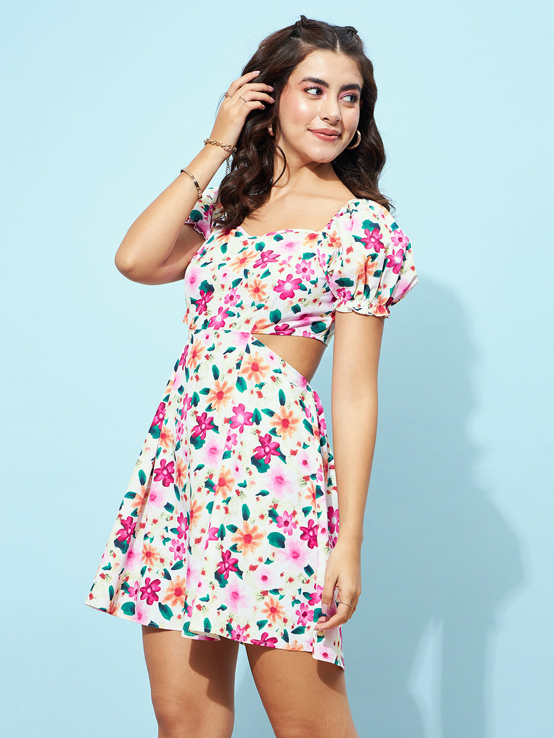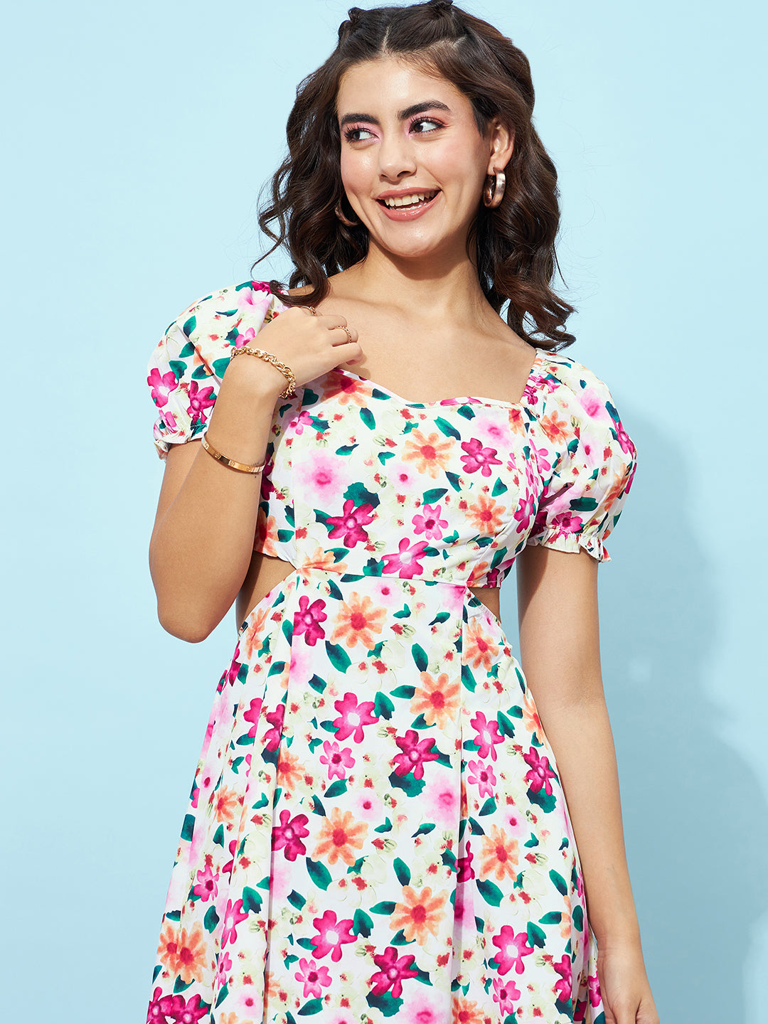 Berrylush Women White & Pink Floral Printed Sweetheart Neck Puff Sleeves Cutout Waist Straight Hem Fit & Flare Mini Dress