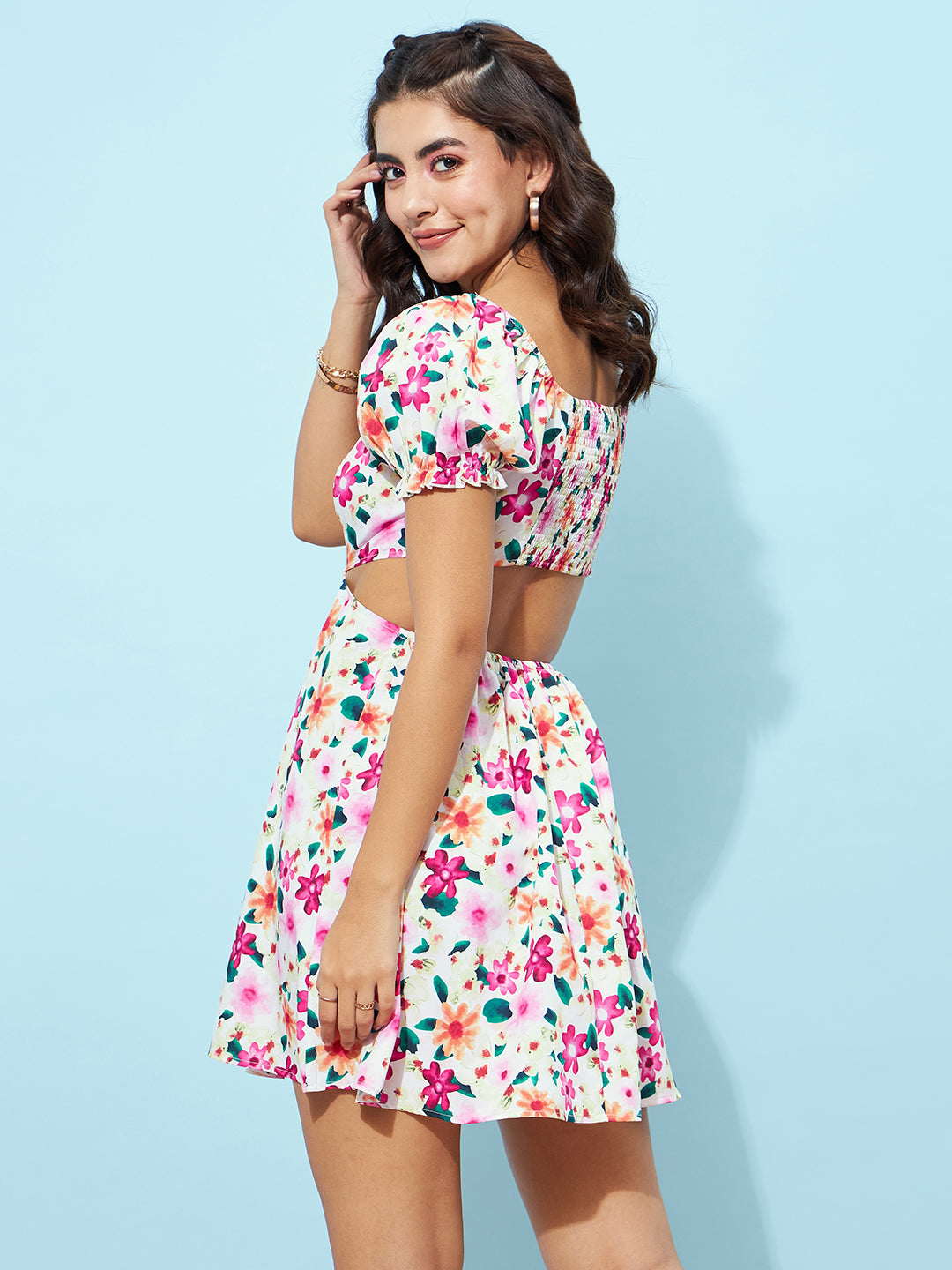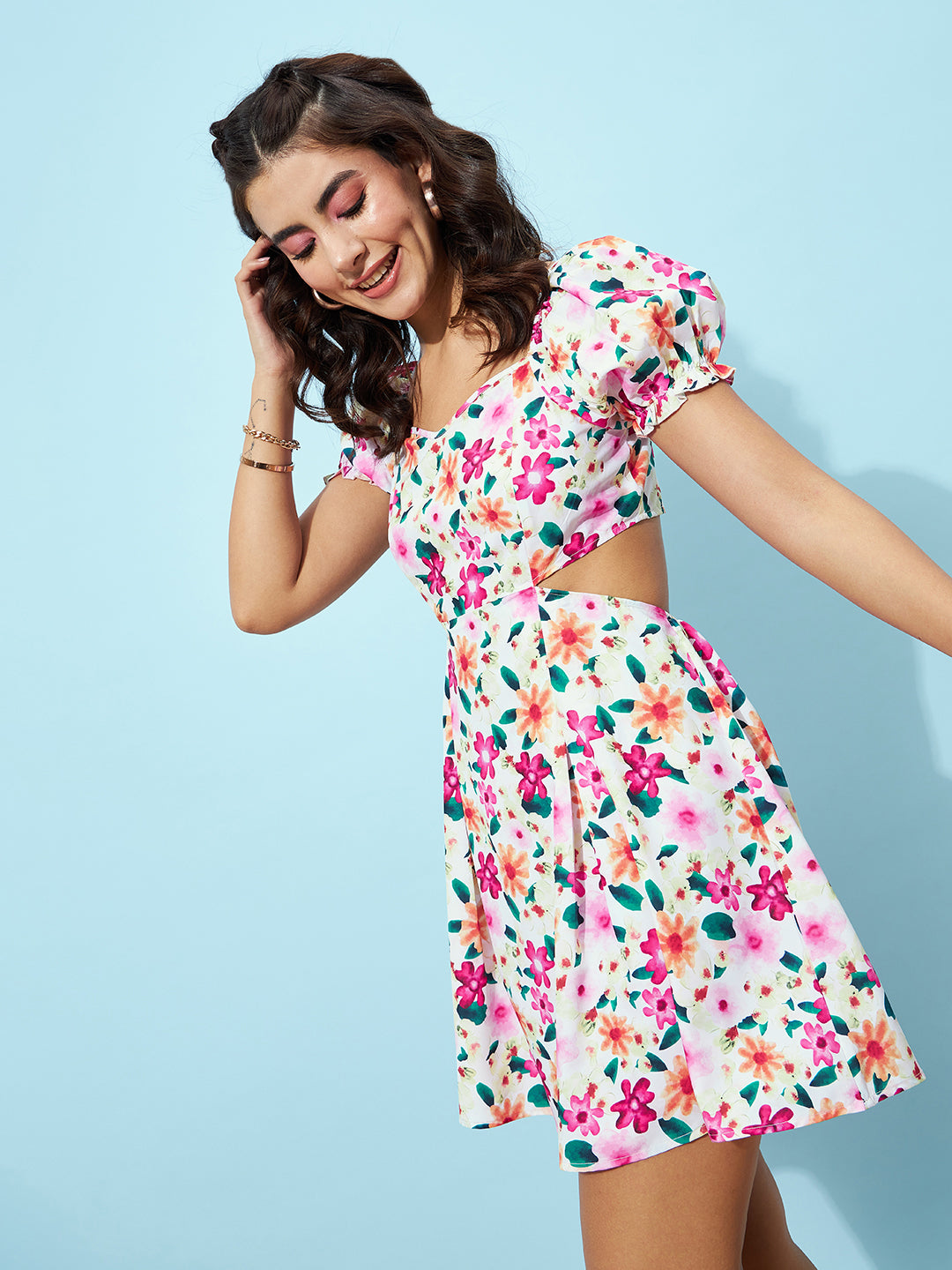 Step into the spotlight with Berrylush's stunning White & Pink Floral Printed Mini Dress, perfect for any party where making a memorable impression is key. This exquisitely woven polyester dress features enchanting puff sleeves and a chic sweetheart neckline that elegantly frames your décolletage. Decorated with vibrant floral prints and enhanced by a playful cutout waist, this fit-and-flare silhouette flatters every curve while maintaining an air of classic femininity. The straight hemline adds a neat finish to this captivating ensemble, ensuring you look effortlessly stylish from every angle.