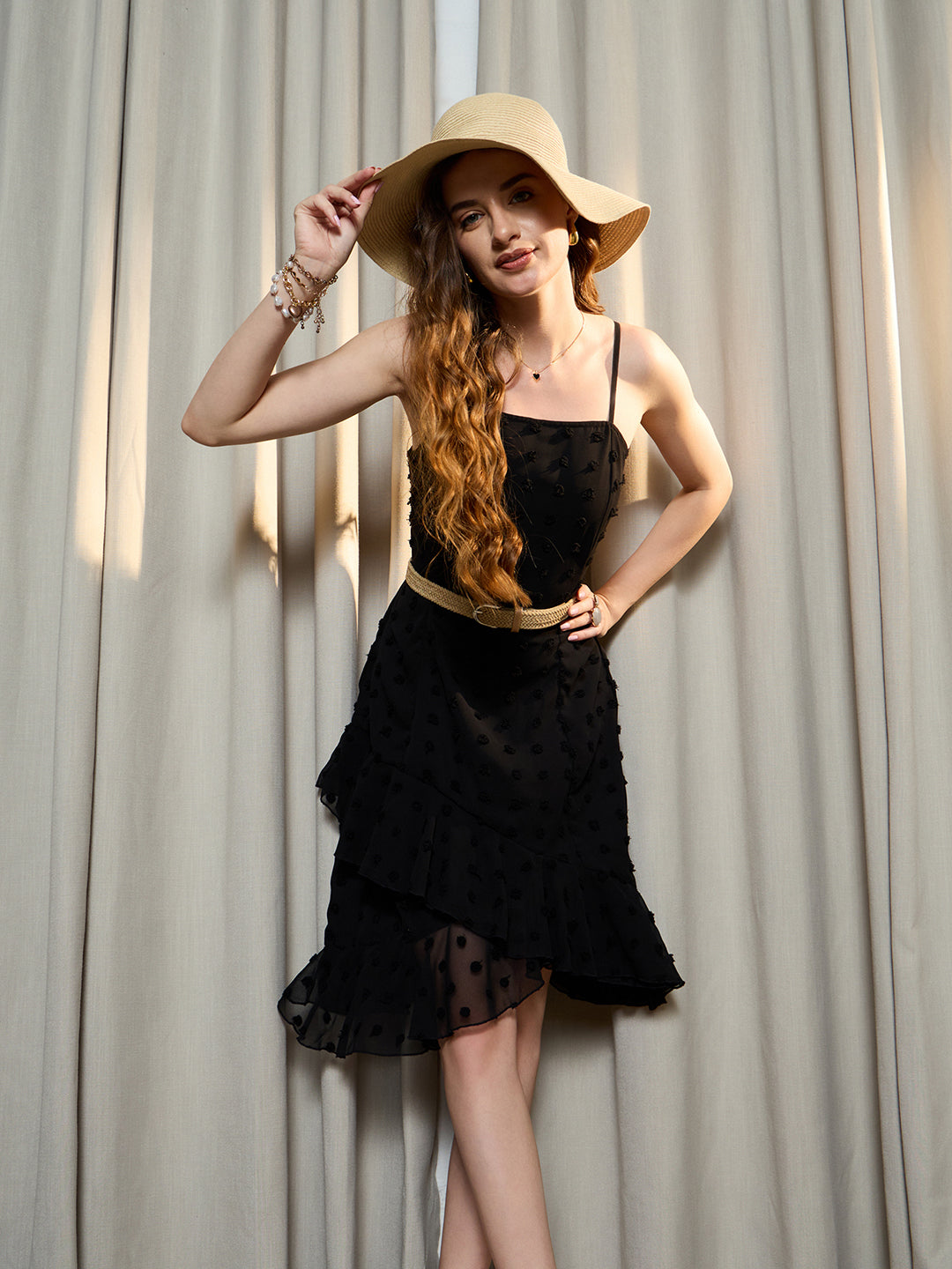 Step into the spotlight with Berrylush's Solid Black Dobby Weave Mini Dress, designed for the ultimate party-goer. This exquisite piece features a sophisticated square neckline and a playful sleeveless cut that accentuates your shoulders beautifully. Crafted from premium polyester with an intricate dobby weave, this dress promises both comfort and durability. The high-low hem adds a dramatic flair to your movements, while the layered skirt creates a stunning fit-and-flare silhouette that flatters any body type. Complete with opaque lining for coverage, captivating cutout detailing at the back secured by an elegant tie-up closure ensures all eyes will be on you as you dazzle through your evening engagements!