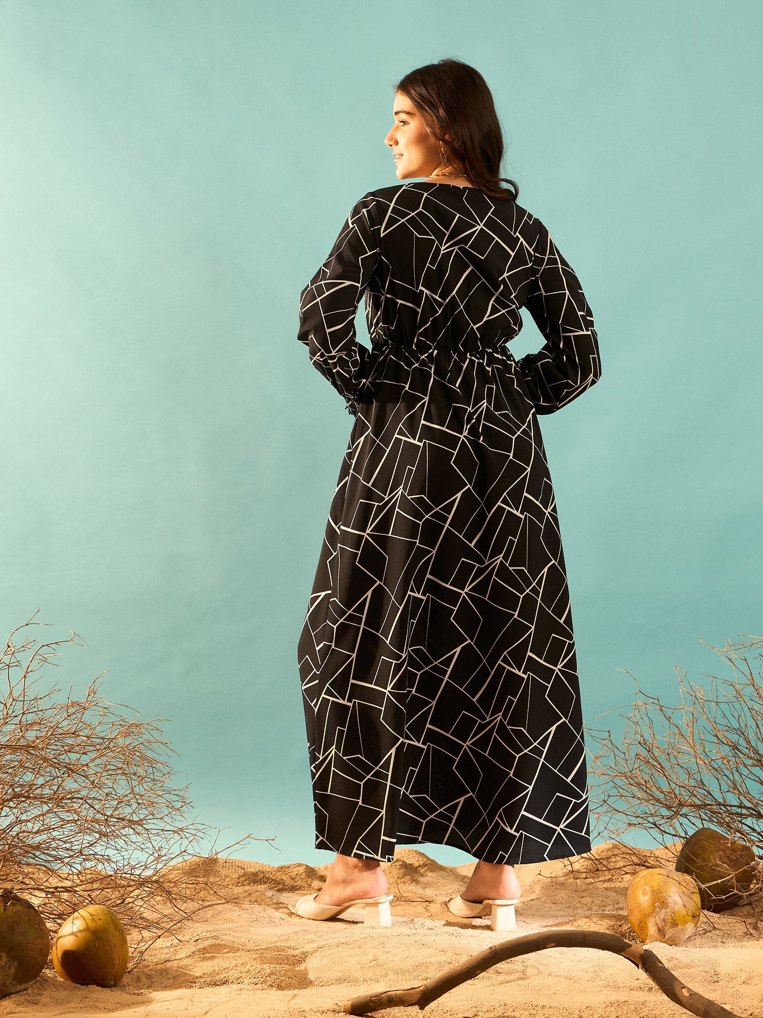 Berrylush Women Black & White Geometric Printed V-Neck Bishop Sleeves Flared A-Line Maxi Dress