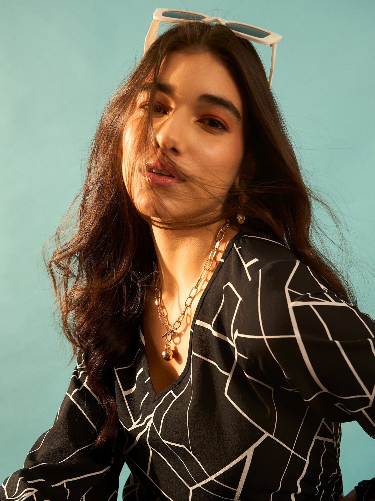 Step out in style with the Berrylush Black & White Geometric Printed Maxi Dress, perfect for any casual occasion. This dress features a striking V-neck and long bishop sleeves that add a touch of sophistication and flair. Crafted from high-quality polyester, its woven fabric ensures durability while offering comfort throughout the day. The A-line silhouette paired with a flared hemline elegantly accentuates your figure, making it as flattering as it is fashionable. The bold geometric print stands out against the classic black and white colours, ensuring you make a memorable impression wherever you go.