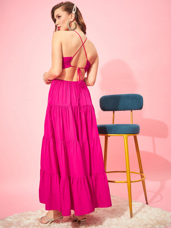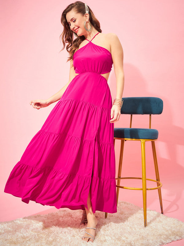 Berrylush Women Solid Pink Halter Neck Sleeveless Tie-Up Crisscross Backless Thigh-High Slit Ruffled Fit & Flare Maxi Dress