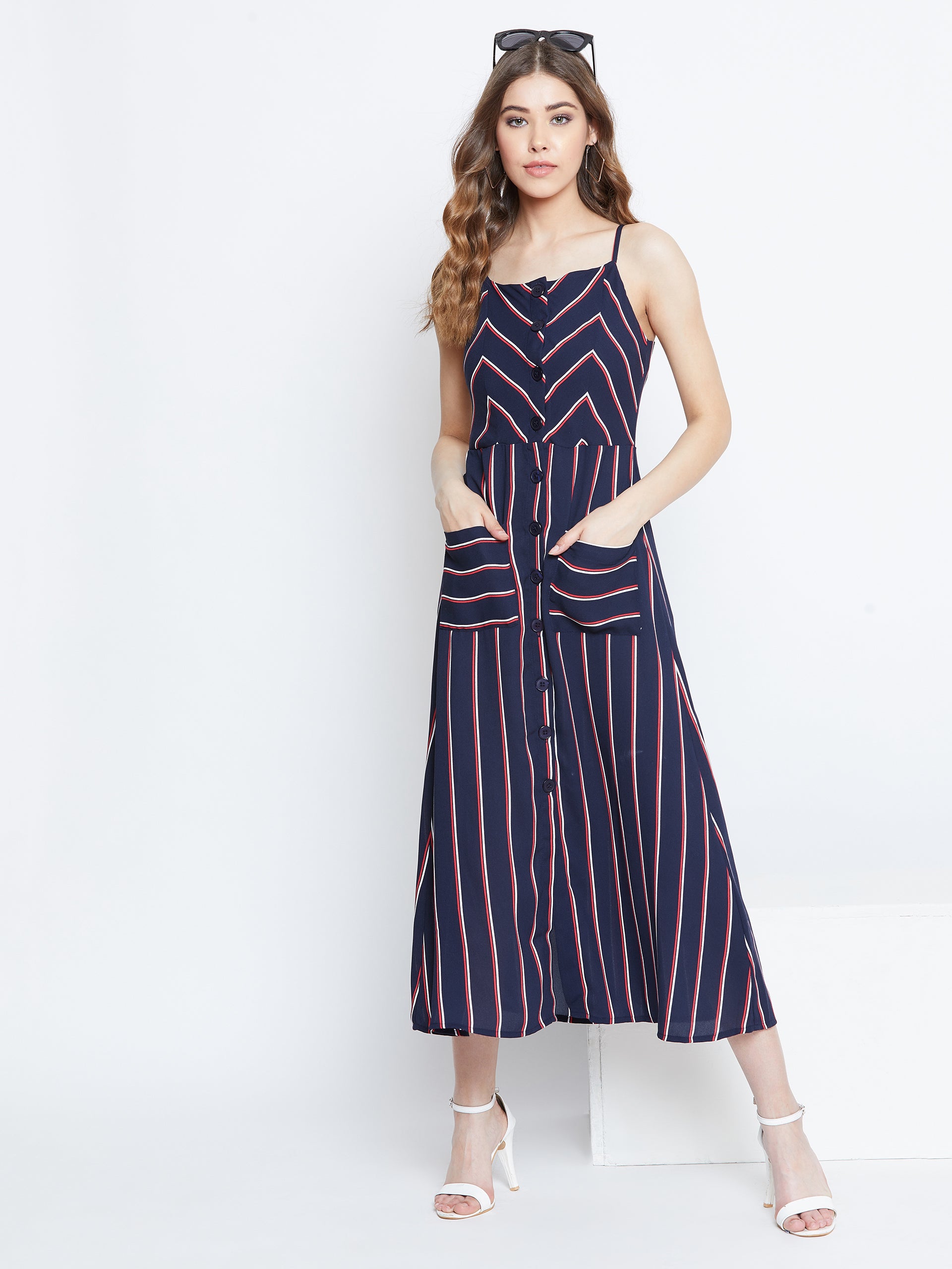 If you strive for fun as well as stylish texture for restyling your wardrobe for every season, then this cinematic Navy Blue & Red Striped Pattern Square Neck Fit & Flare Midi Dress from the stripe pattern collection presented by Berrylush. This dress is a perfect outfit for your capsule wardrobe as it goes well-acquainted with the themes of all the seasons. The navy blue shade of the dress depicts your calming side and reflects coordination with a neutral accent while the adjoining red stripe pattern adds a creative and fun vibe. Designed with front two pockets which present a practical feature of the dress and the fit and flare shape assemble a flattering appeal. Create a stunning final look by pairing it up with your favourite high-heels and a trendy bag.