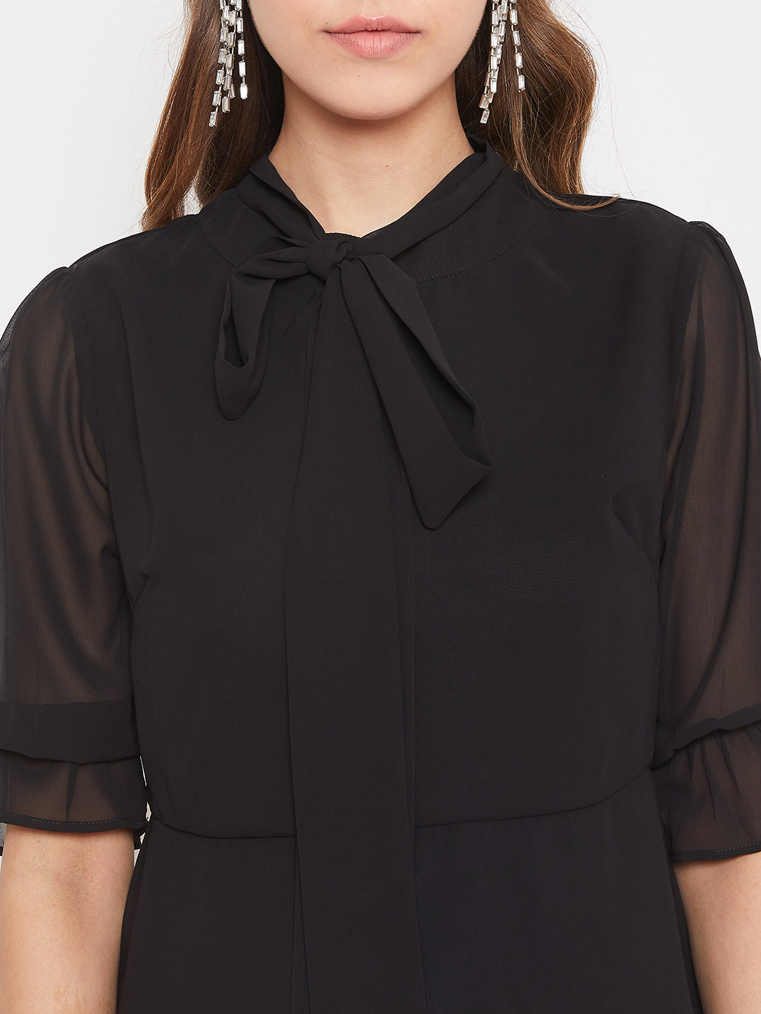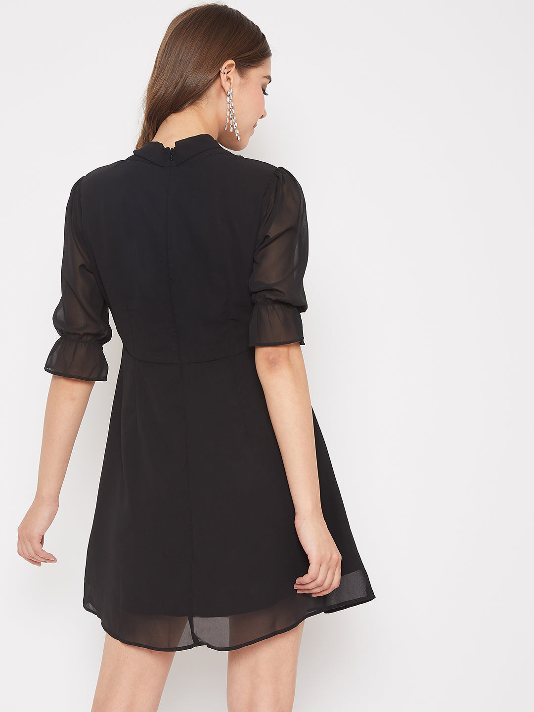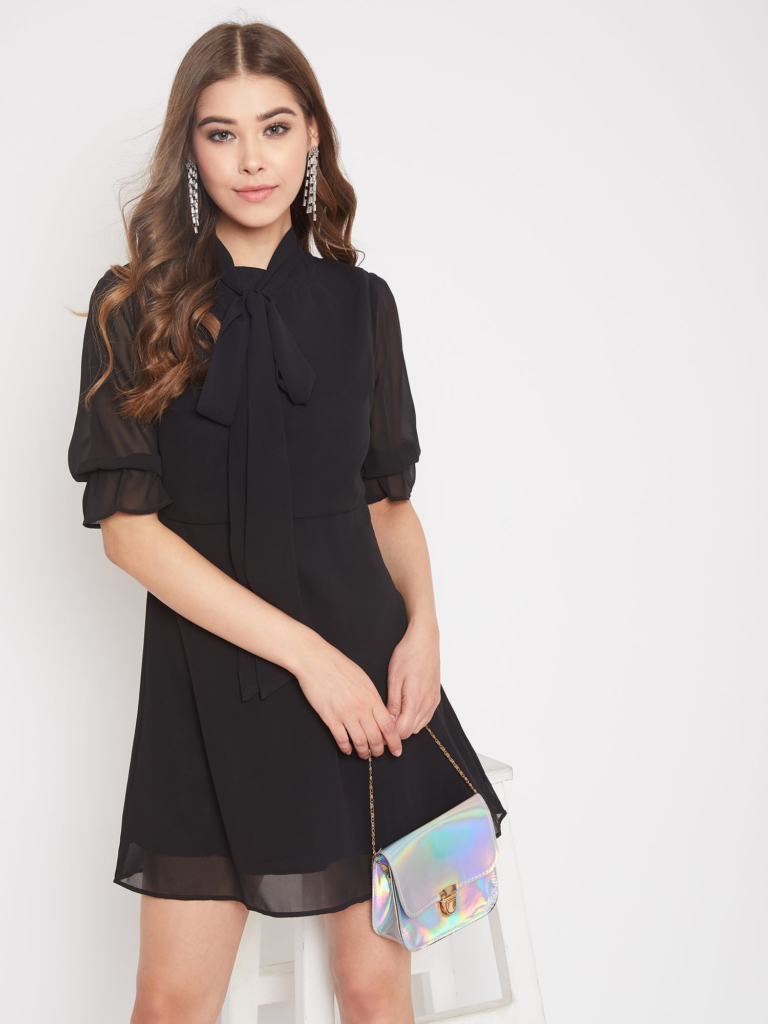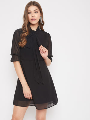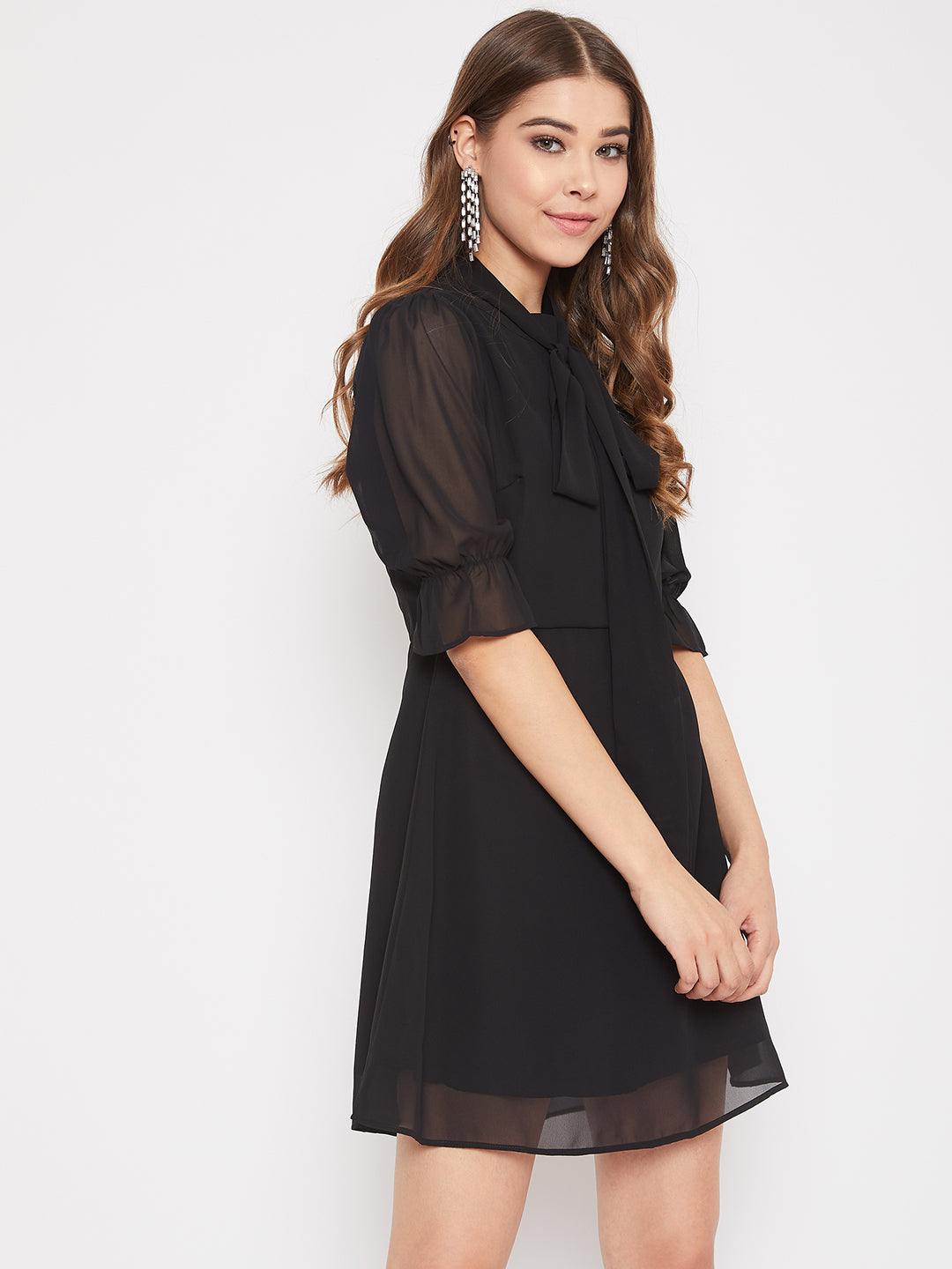 Berrylush Women Solid Black Tie-Up Neck Fit & Flare Mini Dress