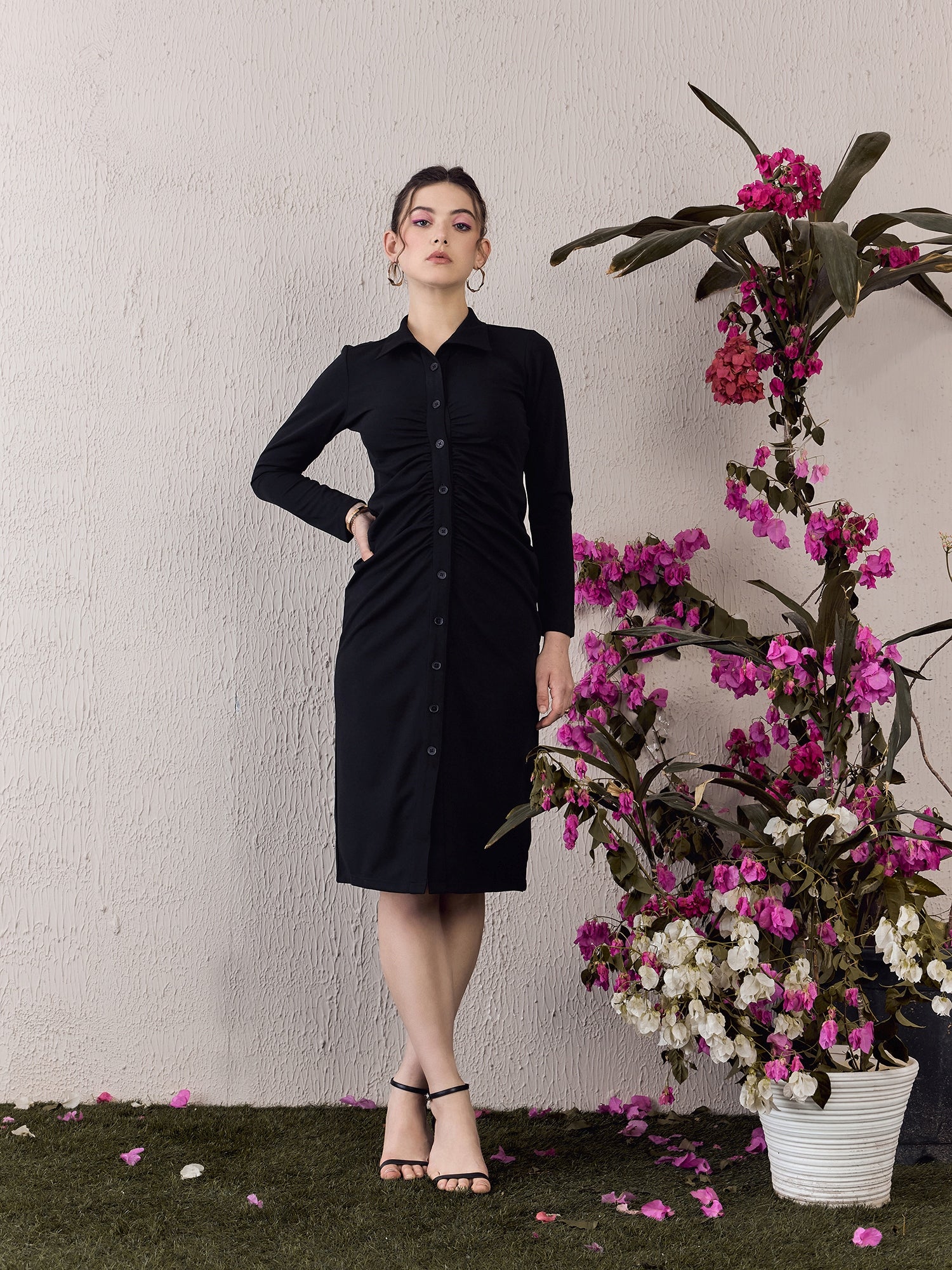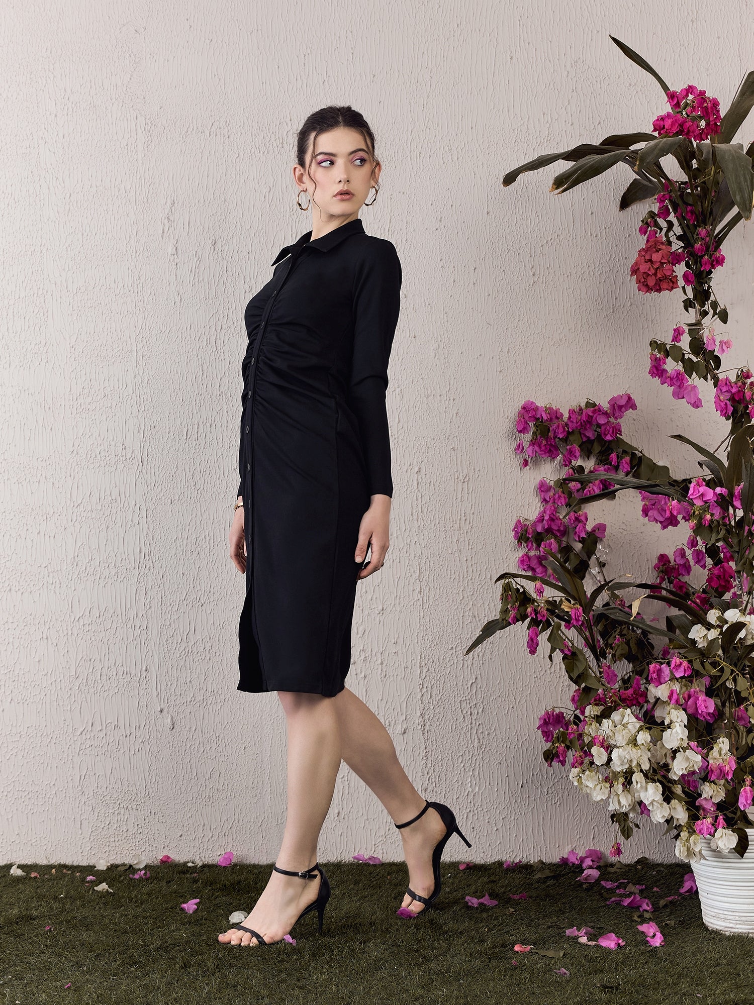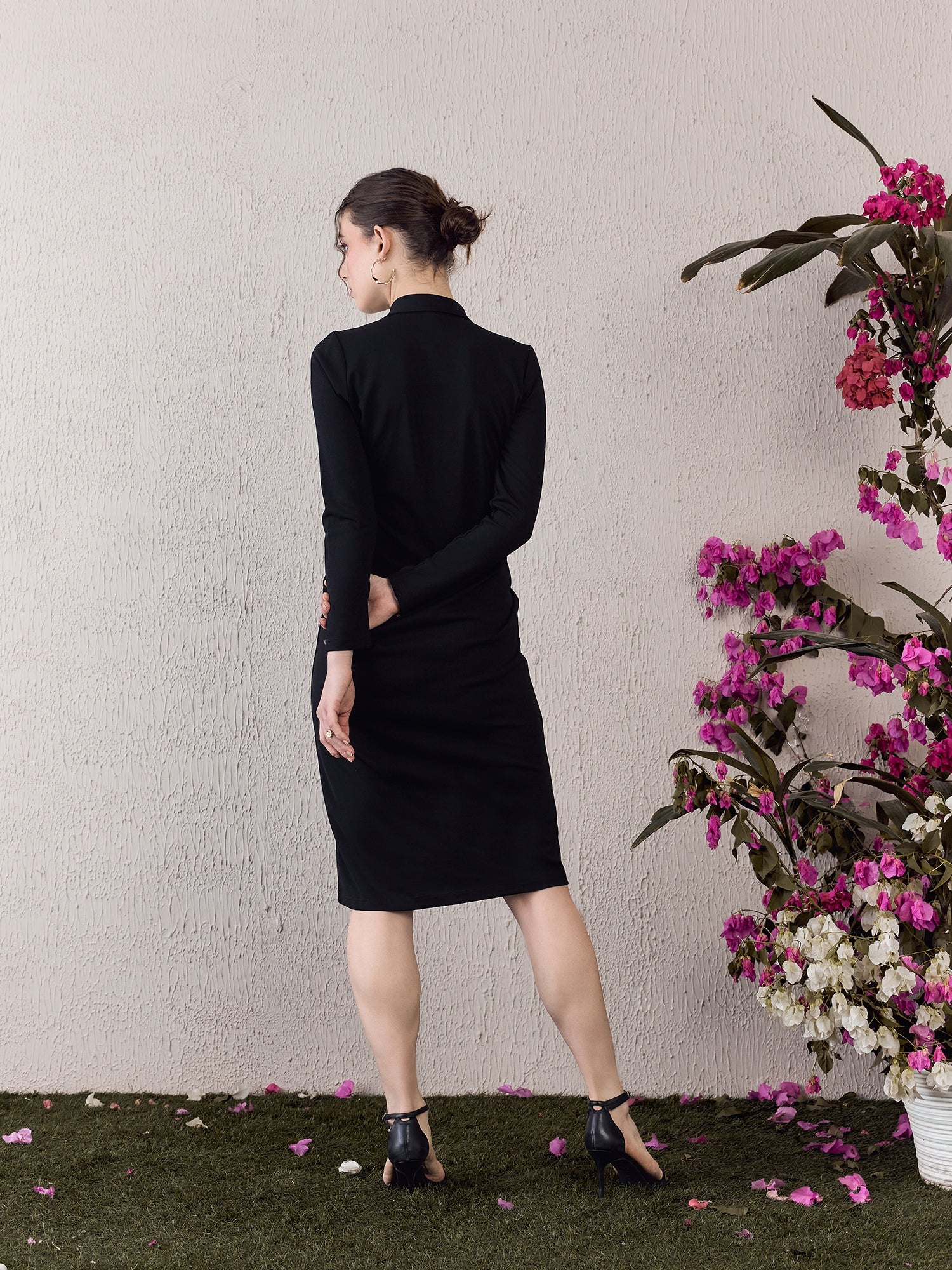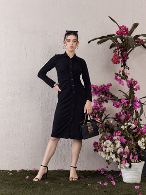 Step into the spotlight with Berrylush’s Solid Black Bodycon Midi Dress, designed to make you shine at any party. Its sleek collar neck and long sleeves balance sophistication with a touch of allure, emphasizing a straight silhouette that elegantly hugs your curves. Crafted from soft knitted polyester for comfort that lasts all night long, this dress features a button-up front that adds both style and functionality. The classic solid black colour ensures versatility while maintaining timeless appeal. Perfect for those who appreciate an ensemble that’s as chic as it is flattering - make your next event unforgettable in this exquisite piece!