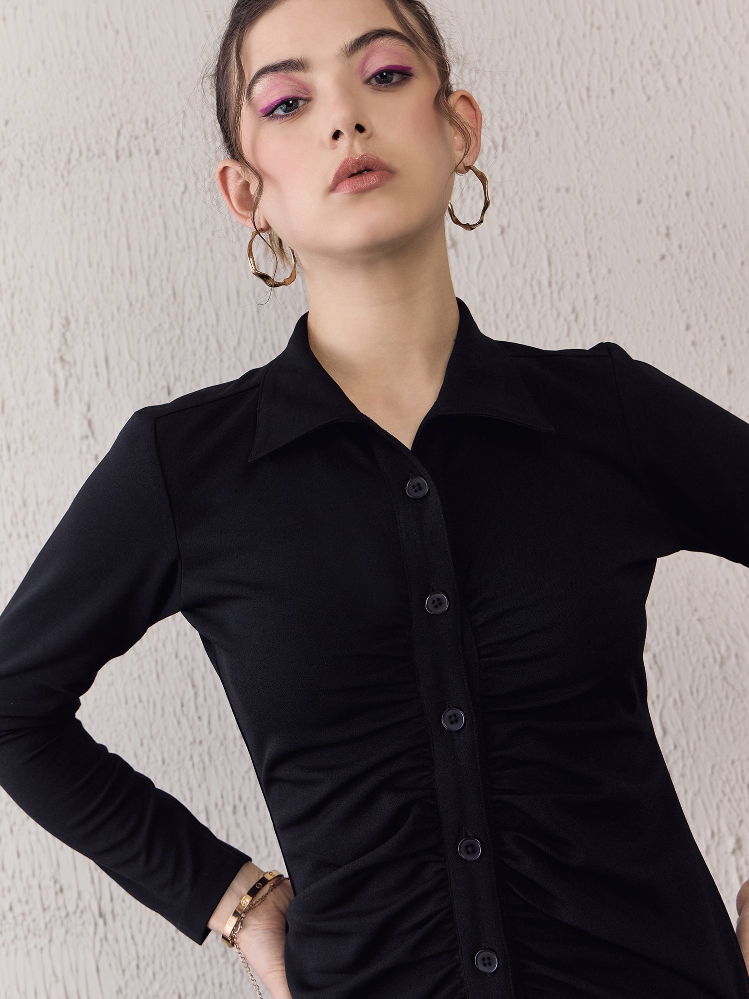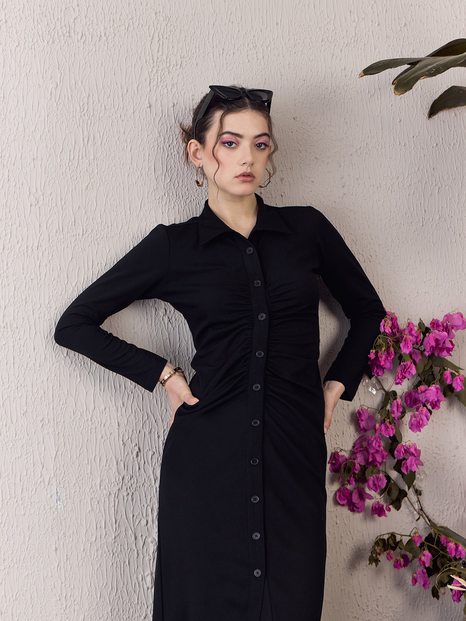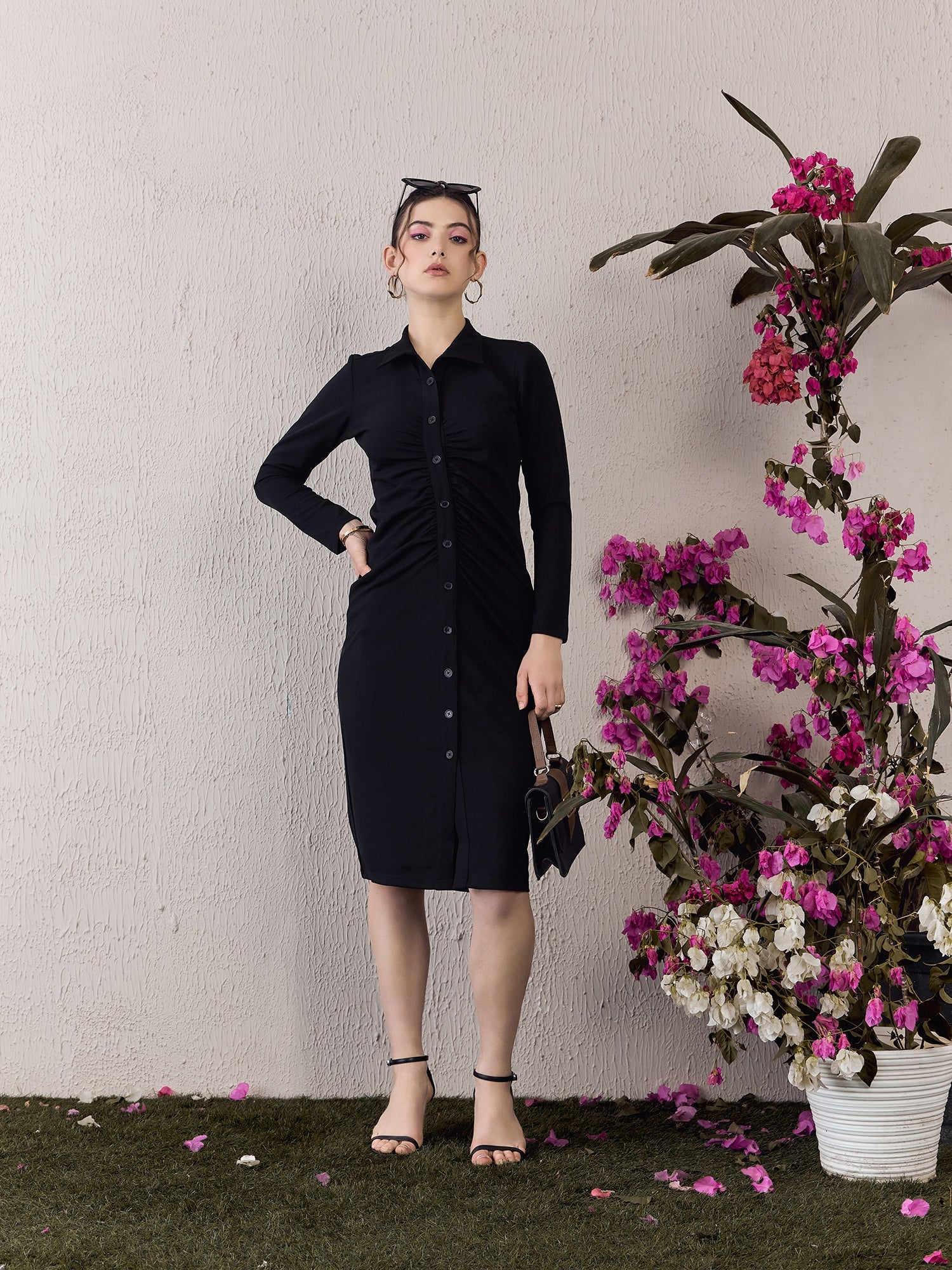 Step into the spotlight with Berrylush’s Solid Black Bodycon Midi Dress, designed to make you shine at any party. Its sleek collar neck and long sleeves balance sophistication with a touch of allure, emphasizing a straight silhouette that elegantly hugs your curves. Crafted from soft knitted polyester for comfort that lasts all night long, this dress features a button-up front that adds both style and functionality. The classic solid black colour ensures versatility while maintaining timeless appeal. Perfect for those who appreciate an ensemble that’s as chic as it is flattering - make your next event unforgettable in this exquisite piece!